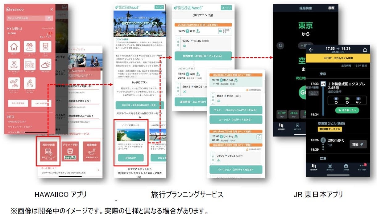JALとJR東日本は今般、ハワイ州観光局公認アプリ「HAWAIICO」(*1)にて、ハワイ現地での旅行計画を簡単・便利に行うことができる「旅行プランニングサービス」機能をリリースしました。また、日本国内の新幹線などの予約が可能な「えきねっと」や、経路検索ができる「JR東日本アプリ」とも連携し、ハワイ現地だけでなく、日本国内での移動についてもサポートします。