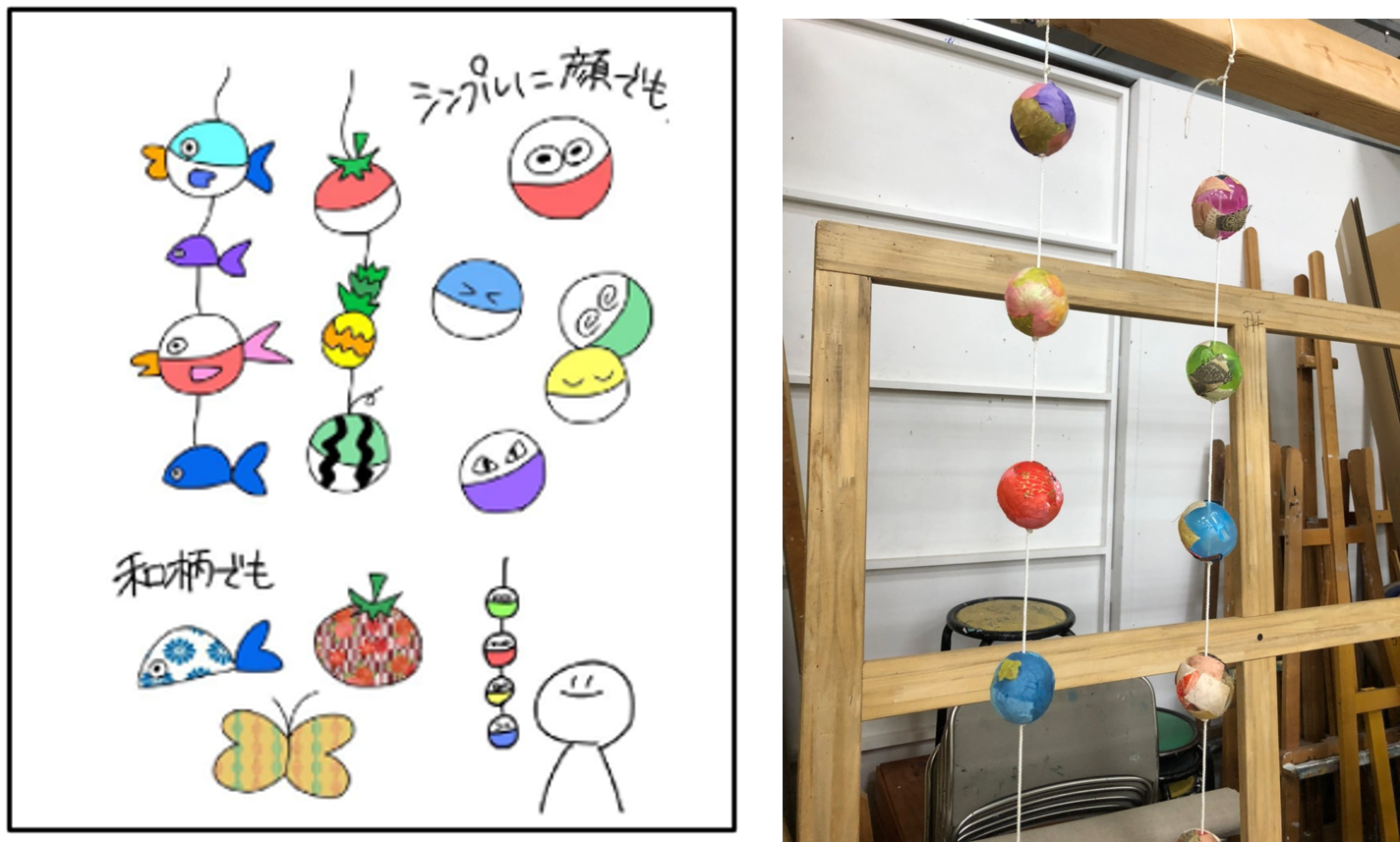 (左写真:まんまるつるし飾りイメージイラスト、右写真:実際の作品)