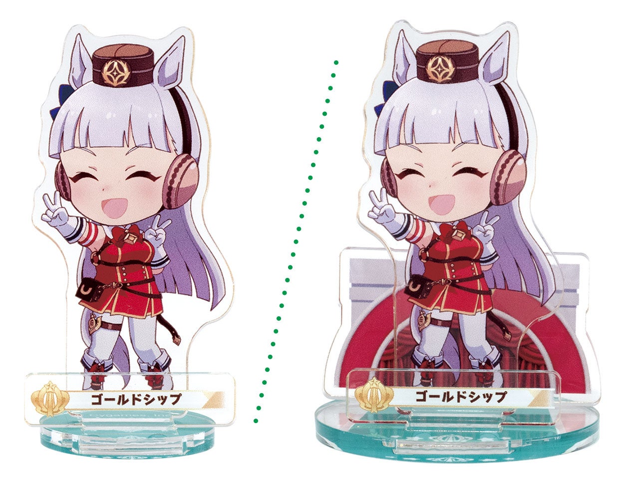 パドックでポーズをとるウマ娘達の姿を可愛く再現するアクリルスタンド、シリーズ第2弾!ゲーム中のレース前「パドック」でのシーンをイメージし、好調~絶好調のアクションをするウマ娘達の姿をこの商品のために描きおろした新規イラストで表現しました。個性豊かなキャラクター全10種をラインアップ!台座はそれぞれコンパクトに飾れるノーマル台座の他、レアバージョンとしてパドックをイメージした背景つき台座もあります。台座は共通ですので、他のキャラクターに差し替えて飾ることも可能です。