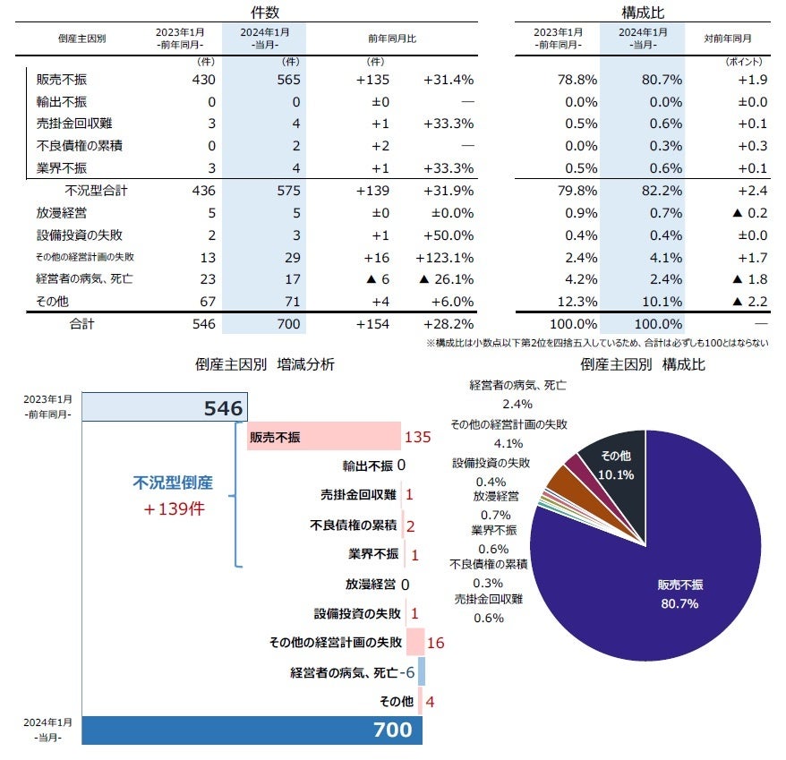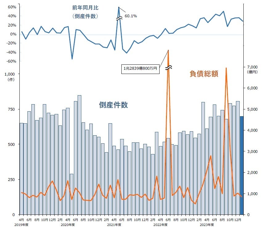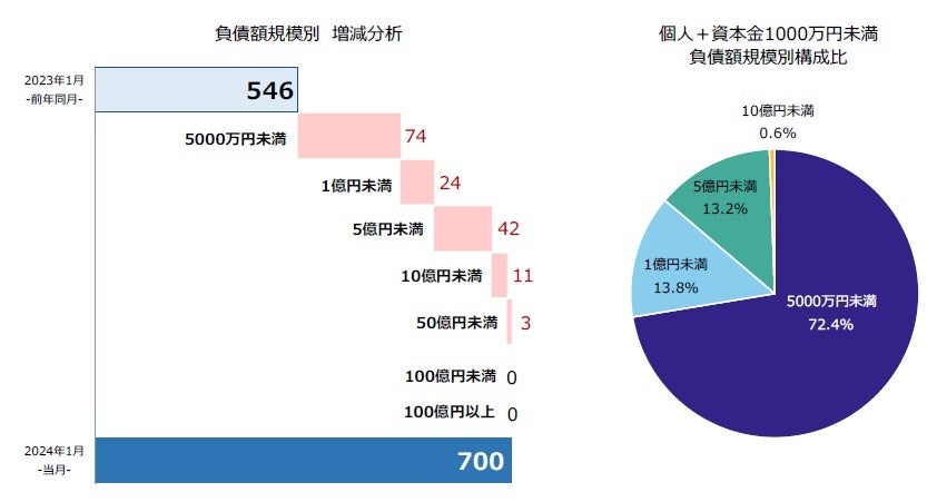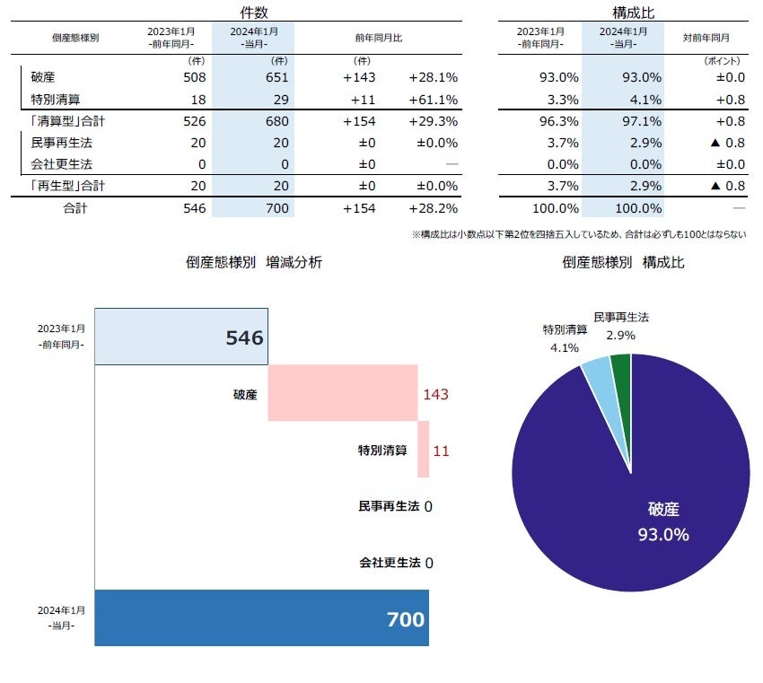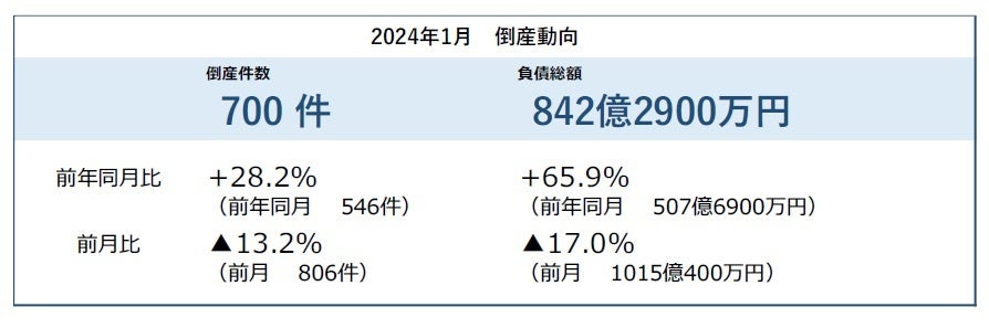2024年1月の企業倒産は700件発生し、前年同月(546件)を28.2%(154件)上回った。2022年5月から21カ月連続で前年同月を上回り、1月としては2019年(713件)以来4年ぶりに700件台となった。中小・零細企業を中心に、物価高や人手不足、コロナ支援策縮小の影響を受けた倒産が目立ち、「ゼロゼロ融資後倒産」が引き続き高水準で推移した。