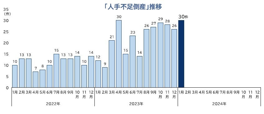 「人手不足倒産」は、2024年1月に30件(前年同月12件、150.0%増)発生した。単月の件数としては、過去最多だった2023年4月(30件)に並んだ。2023年8月以降、前年同月を大幅に上回る水準で推移している。また、2024年1月に発生した、従業員や経営幹部などの退職・離職が直接・間接的に起因した「従業員退職型」の倒産は9件だった。