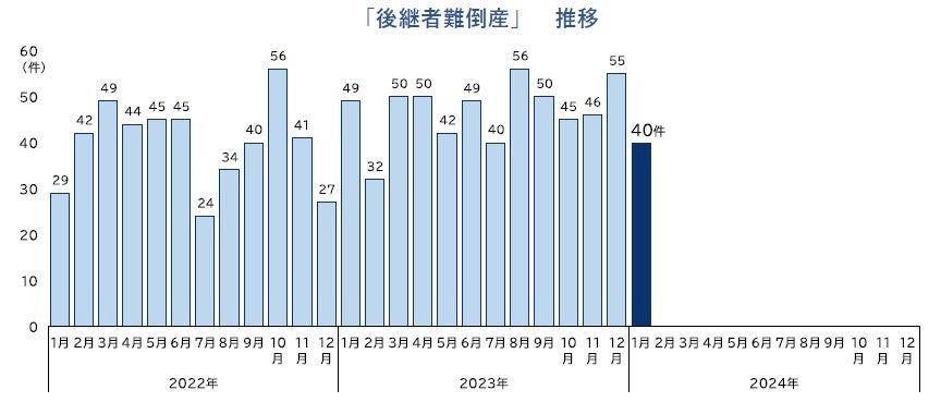 「後継者難倒産」は、2024年1月に40件(前年同月49件、18.4%減)にとどまり、3カ月ぶりに前年同月を下回った。このうち、「経営者の病気・死亡」が要因となった倒産は13件発生し、1月全体の32.5%を占めた。ポストコロナで先行き見通しが厳しくなるなかで、事業承継をあきらめる企業の倒産が数多く発生した。