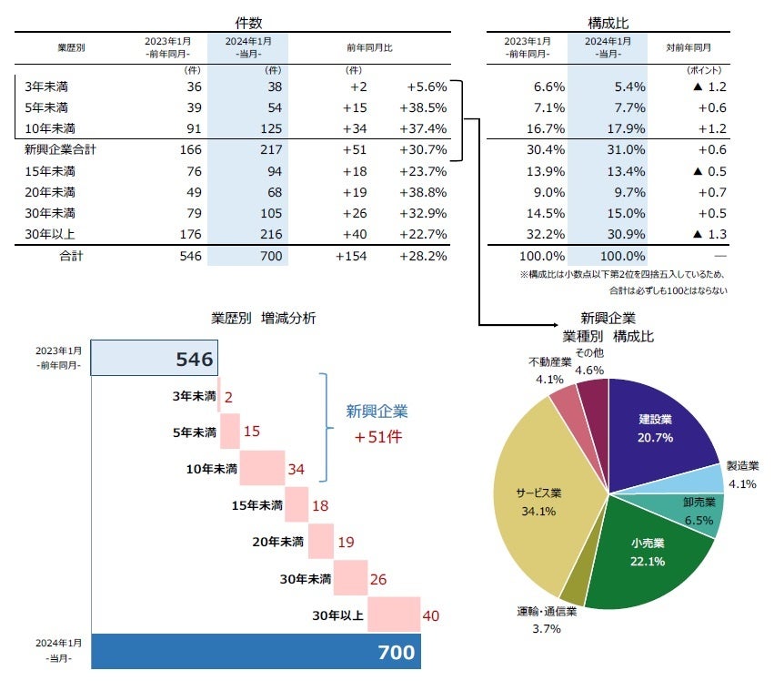 業歴10年未満の『新興企業』[「3年未満」(前年同月36件→38件、5.6%増)、「5年未満」(同39件→54件、38.5%増)、「10年未満」(同91件→125件、37.4%増)]は217件(前年同月166件、30.7%増)と、23カ月連続で前年同月を上回った。内訳を業種別にみると、「サービス業」(同47件→74件、57.4%増)が最多、「小売業」(同45件→48件、6.7%増)、「建設業」(同29件→45件、55.2%増)が続いた。