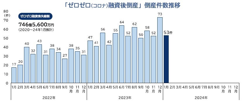 「ゼロゼロ(コロナ)融資後倒産」は、2024年1月に53件(前年同月47件、12.8%増)発生した。増加率は初めて10%台にとどまり、急増ペースが一段落した。「不良債権(焦げ付き)」に相当するコロナ融資喪失総額は推計で約746億5600万円にのぼり、国民一人あたり600円超の負担が発生している計算になる。