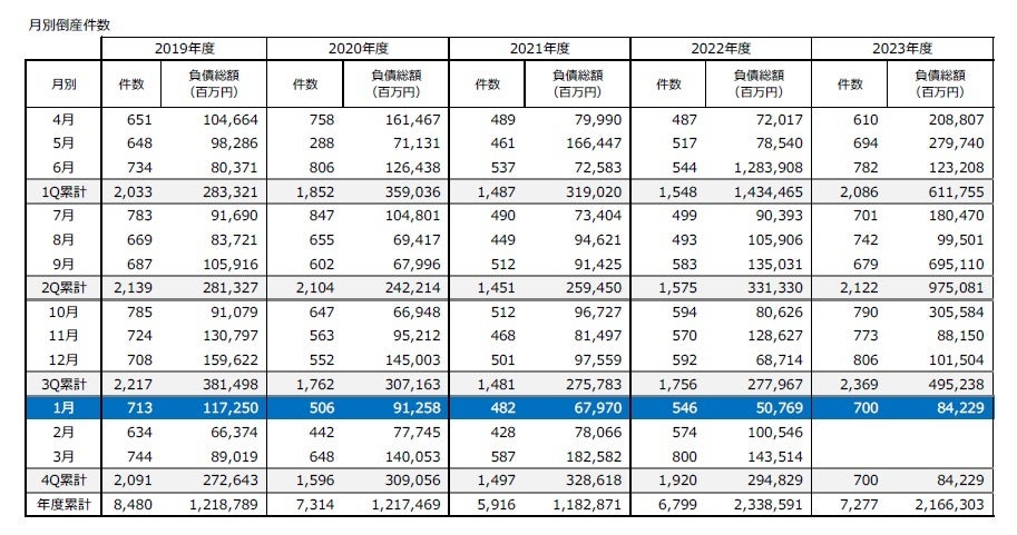 年度ベースでみると、2023年4月-2024年1月の累計は7277件となり、1月時点で2022年度(6799件)を超えた。このままのペースで推移すれば、2023年度は9000件前後に達し、2014年度(9044件)以来9年ぶりの水準になる見通し。
