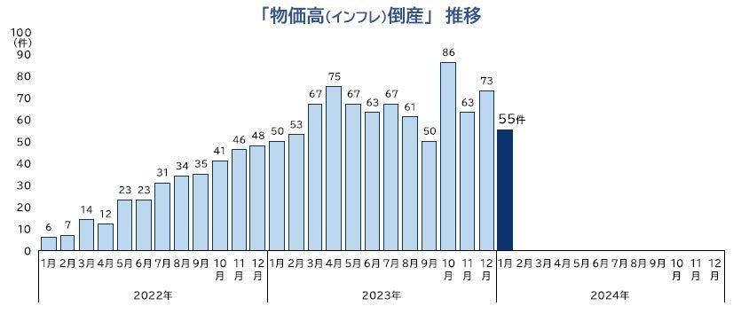 「物価高(インフレ)倒産」は、2024年1月に55件(前年同月50件、10.0%増)発生した。2023年10月(86件)をピークとして、「物価高」直撃の影響は緩和されつつある。他方、十分な価格転嫁ができず経営破綻に至った「値上げ難型」の物価高倒産は2024年1月に10件発生し、単月の件数としては2023年11月(8件)を上回り過去最多を更新した。