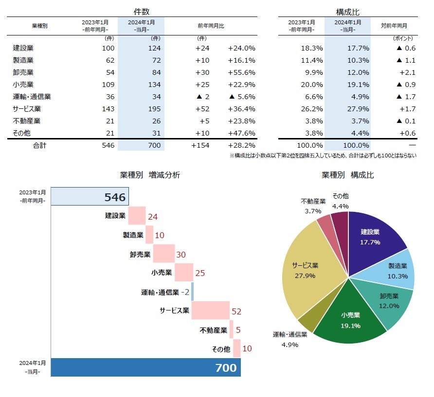 業種別にみると、7業種中6業種で前年同月を上回った。『サービス業』(前年同月143件→195件、36.4%増)が最も多く、『小売業』(同109件→134件、22.9%増)、『建設業』(同100件→124件、24.0%増)が続いた。『サービス業』は、1月としては東日本大震災翌年の2012年(194件)以来、12年ぶりに高い水準となった。増加率でみると、『卸売業』(同54件→84件、55.6%増)が最も高かった。『不動産業』(同21件→26件、23.8%増)を除く6業種の2023年4月-2024年1月の累計件数が、2カ月を残して2022年度を上回った。