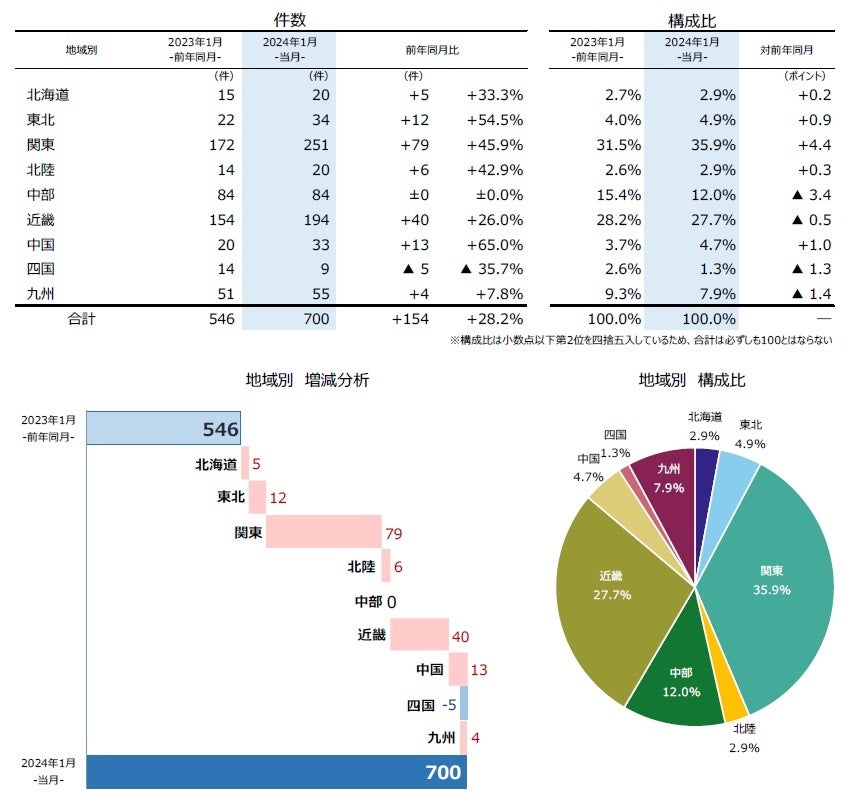 地域別にみると、9地域中7地域で前年同月を上回った。『中国』(前年同月20件→33件、65.0%増)が、13カ月連続で前年同月を上回った。2023年4月-2024年1月の10カ月間で、32都道府県が2022年度の件数を超えており、全国的に増加基調が続いている