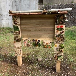 公園の掲示板に飾り付けるパネルにお花や木の実等を使ってデコレーションします。