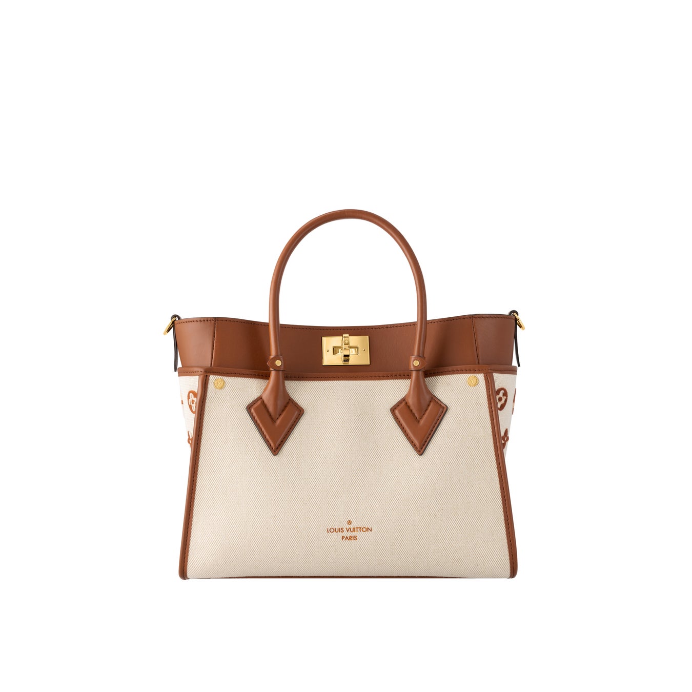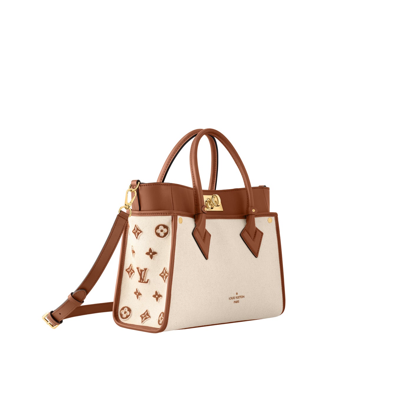 クリーム色のキャンバス生地を使用し、トリミングとトップハンドルにはなめらかなレザーをあしらった「オンマイサイド MM」。キャンバス生地のサイドのマチには、レザーのトリミングと同色のタフタージュの刺繍で表現したモノグラム·パターンが彩りを添えます。内側にはストライプで彩ったキャンバスでライニングを施し、海辺のビーチのような雰囲気が際立ったデザインになっています。