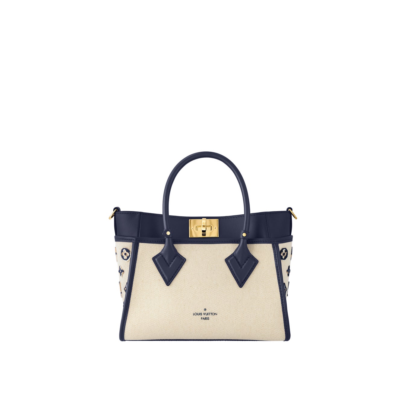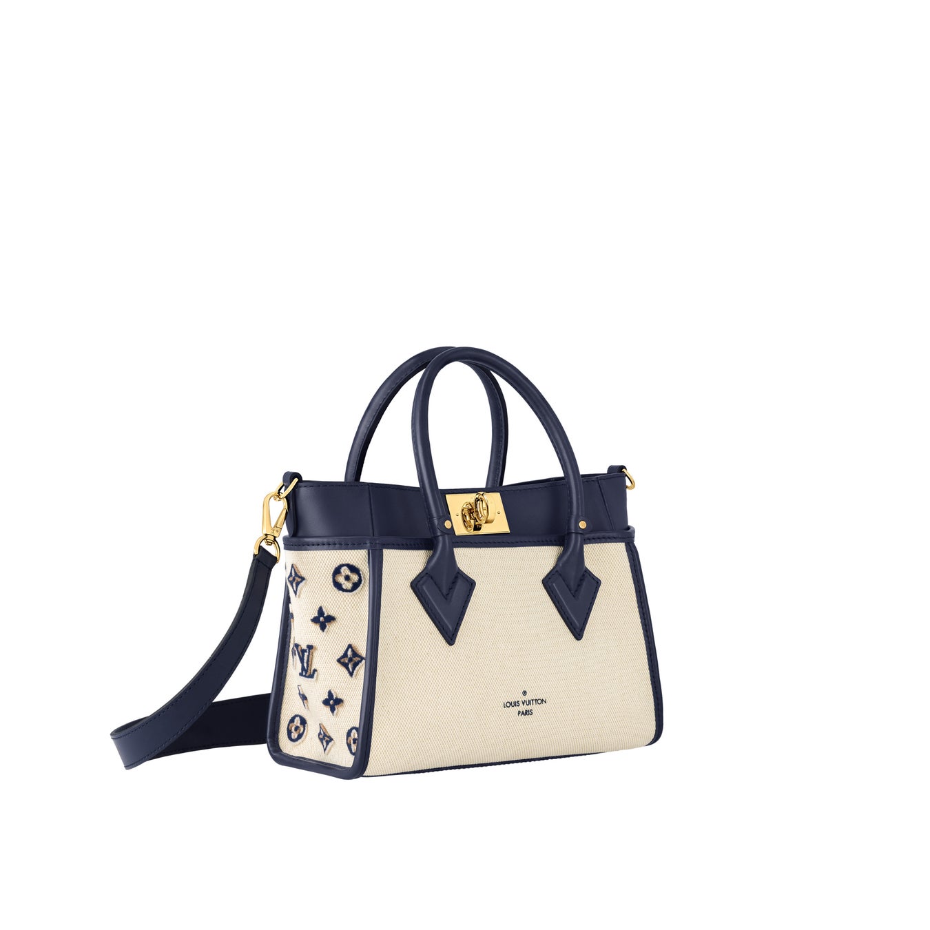 ネイビーブルーのレザーのトリミングと、同系色のトップハンドルが構築的な印象を演出する、コーティング加工を施したキャンバス生地を使用した「オンマイサイド PM」。マチにはタフタージュの刺繍で表現したモノグラム·パターンをあしらって、ラグジュアリーな雰囲気に仕上げられています