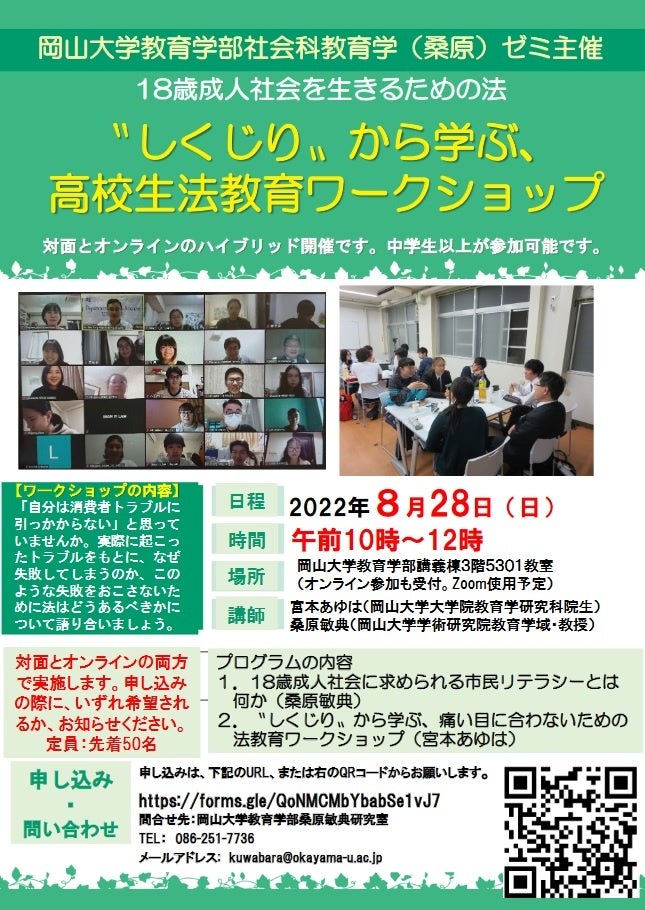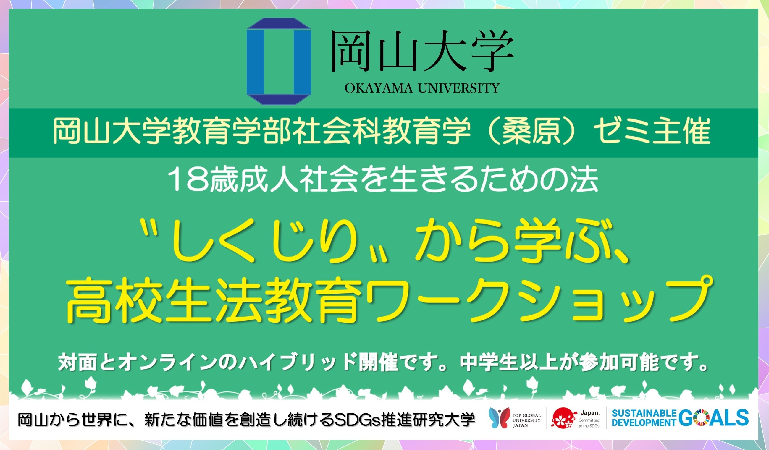 国立大学法人岡山大学(本部:岡山市北区、学長:槇野博史)の大学院教育学研究科では、教育科学専攻の大学院生宮本あゆはさんが企画した高校生対象の法教育ワークショップ「18歳成人社会を生きるための法〝しくじり〟から学ぶ、高校生法教育ワークショップ」を2022年8月28日(日)に岡山大学教育学部(岡山市北区)で開催します。今回は、対面とオンラインのハイブリッド開催です。