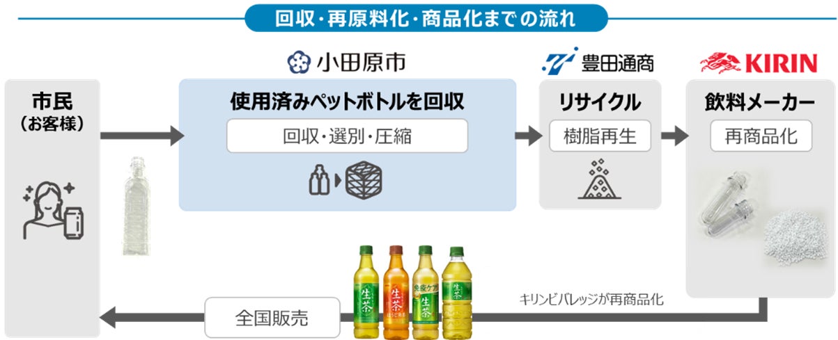 キリンビバレッジは、本協定の下、小田原市で回収された使用済みペットボトルが粉砕・洗浄などの工程を経て、リサイクラーである豊田通商にてリサイクルPET樹脂に再原料化されたものを、新たなペットボトルにリサイクルし当社の一部商品に使用します。本協定により、小田原市において排出される使用済みペットボトルのうち、年間約280tのペットボトルを水平リサイクルできる見込みです。また、市民へのペットボトルの分別回収に関する啓発活動にも取り組んでいきます。