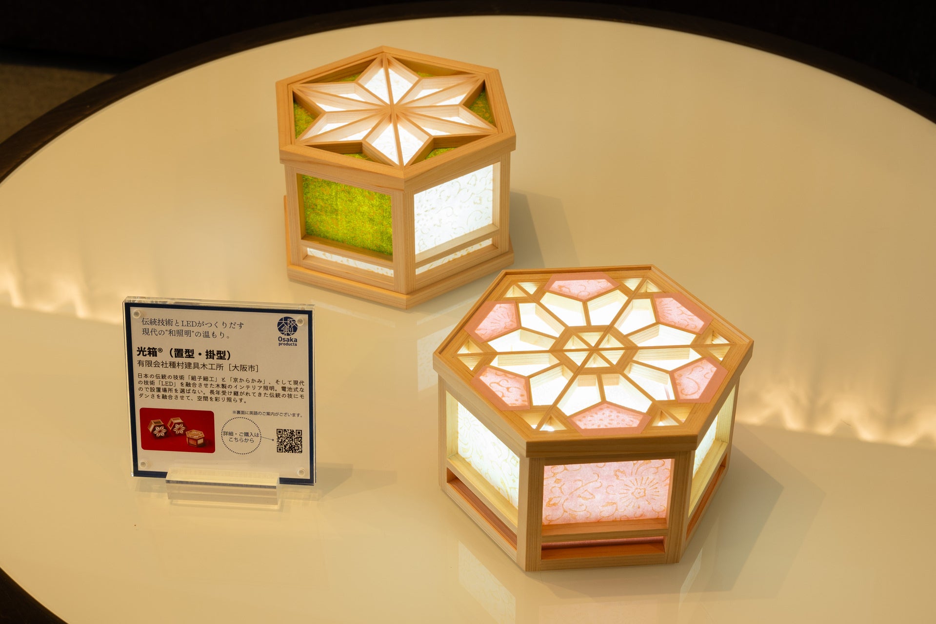 ホテルグランヴィア大阪27階の高品質客室階「グランヴィアフロア」専用のラウンジ内にも、共和鋼業株式会社の「amiMono(アミモノ)ラック」、株式会社トライアードの「OMOSHIROI BLOCK」、有限会社種村建具木工所の「花組子®ライト」を、2025年4月から6月の3ヶ月間展示しております。
