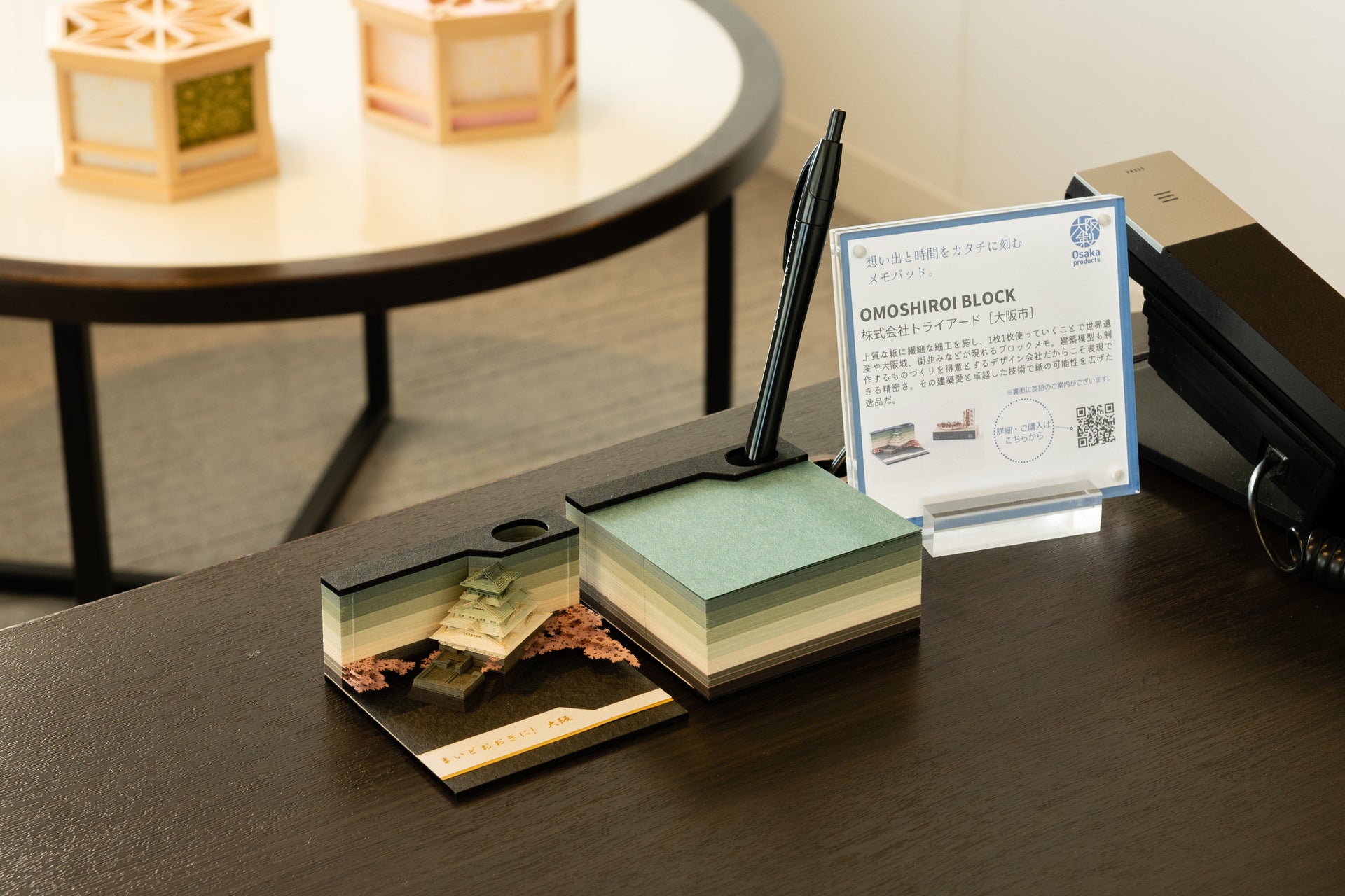 上質な紙に繊細な細工を施し、1枚1枚使っていくことで世界遺産や大阪城、街並みなどが現れるブロックメモ。建築模型も制作するものづくりを得意とするデザイン会社だからこそ表現できる精密さ。その建築愛と卓越した技術で紙の可能性を広げた逸品。