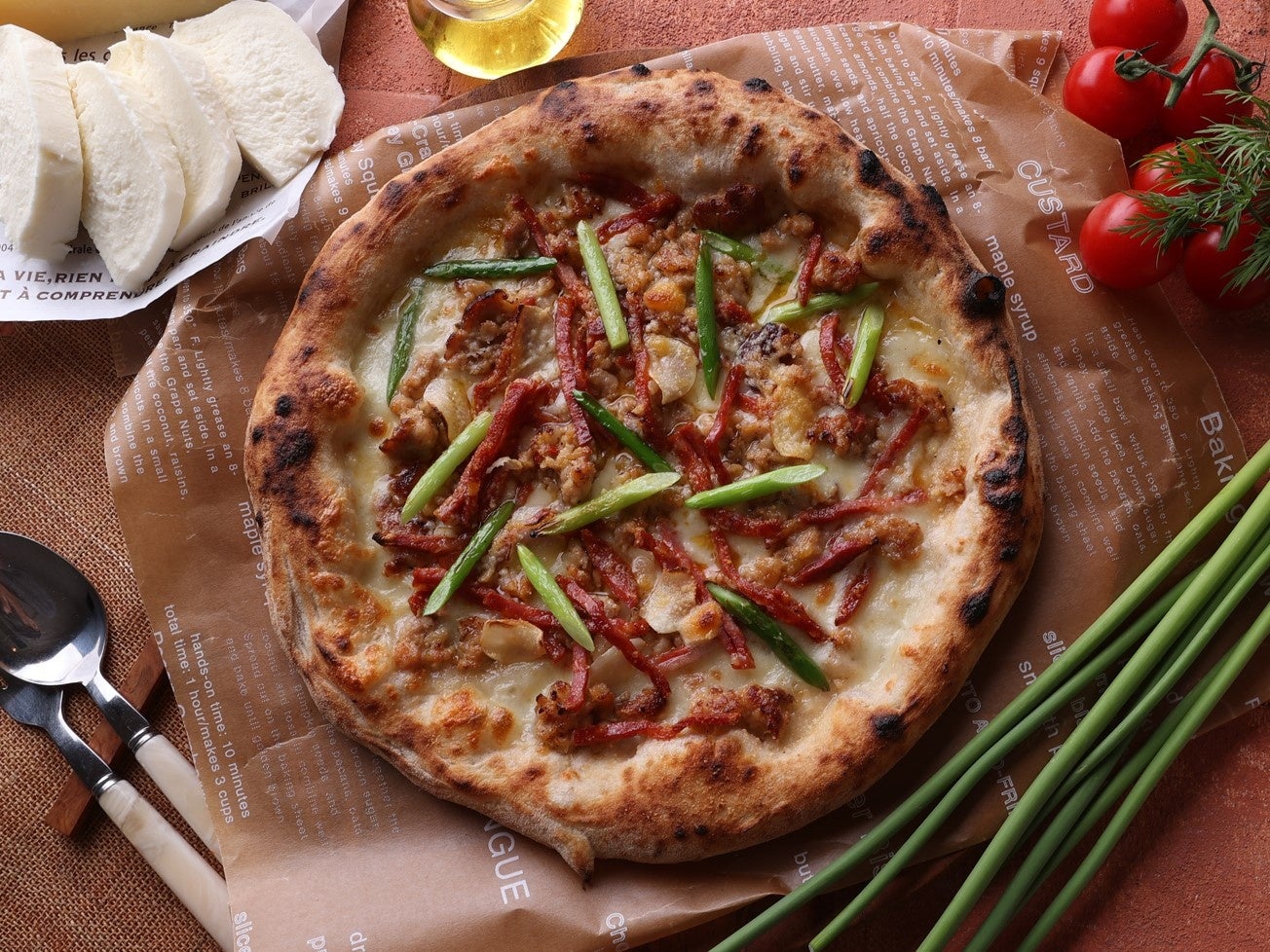 『サルシッチャとサラミ にんにくの芽のピッツァビアンカ』はにんにくの芽、スパイシーなサルシッチャ、サラミにスライスガーリックを散らした夏にぴったりな新作ピッツァです。ソースを使用しないことで、素材の味わいと香りをダイレクトにご堪能いただけます。唐辛子オイルやブラックペッパーを掛けて、更にHOTにお召し上がりいただくのもおすすめです!