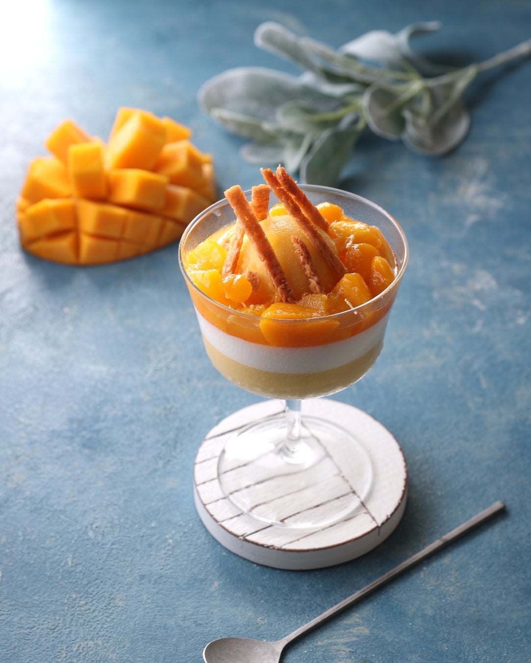 マンゴー果肉にマンゴーシャーベット、更に2層のなめらかなマンゴーココナッツプリンと杏仁豆腐を重ねました。食感と味わいのアクセントになるココナッツクッキーを添えてご提供します。