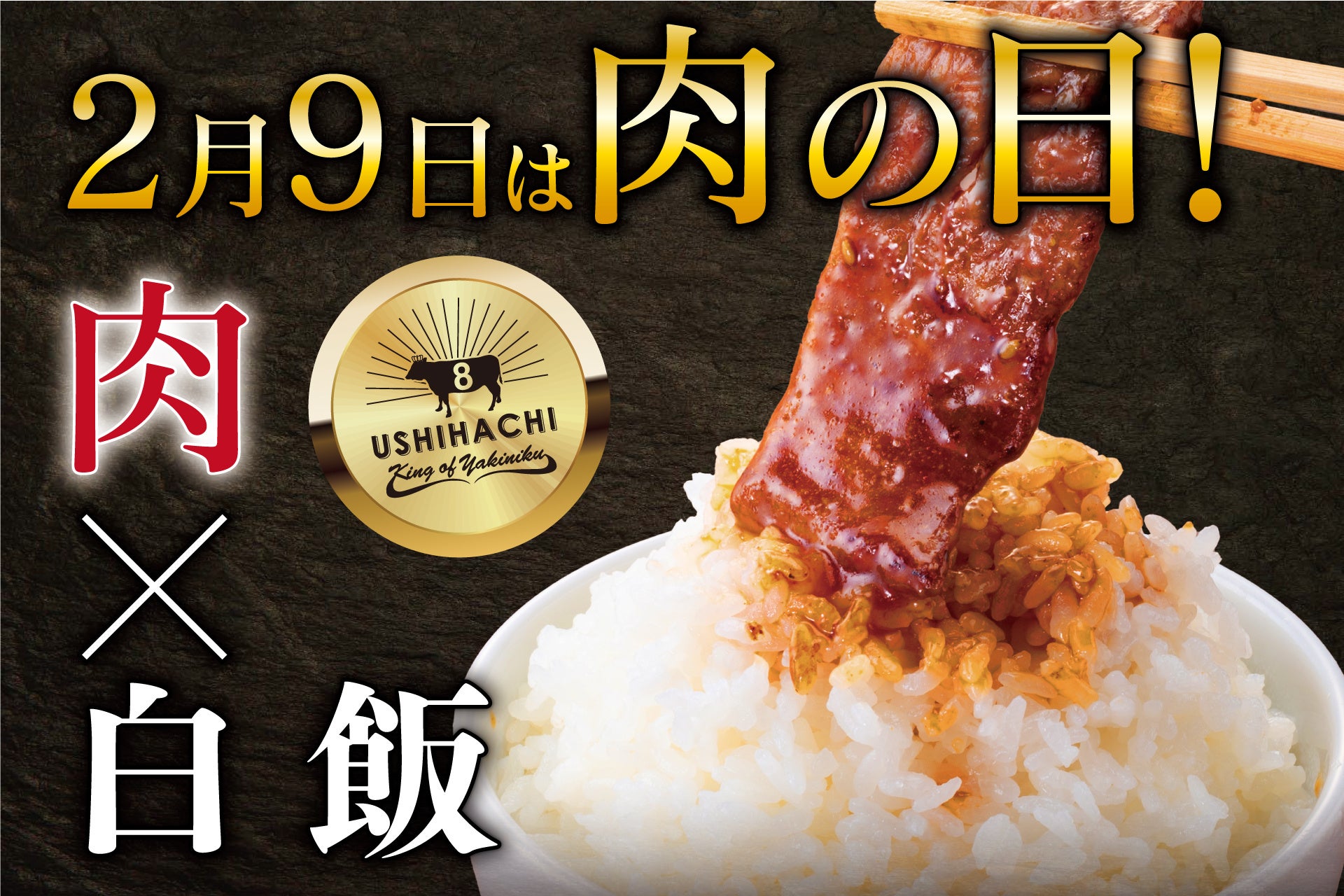 2月9日の『肉の日』に合わせ、「黒毛和牛山盛りカルビ」「松坂牛の大判リブロース一枚焼き」、さらに「白飯(宮城県産つや姫)」を期間限定で提供いたします。(※店舗により提供メニューが異なります)