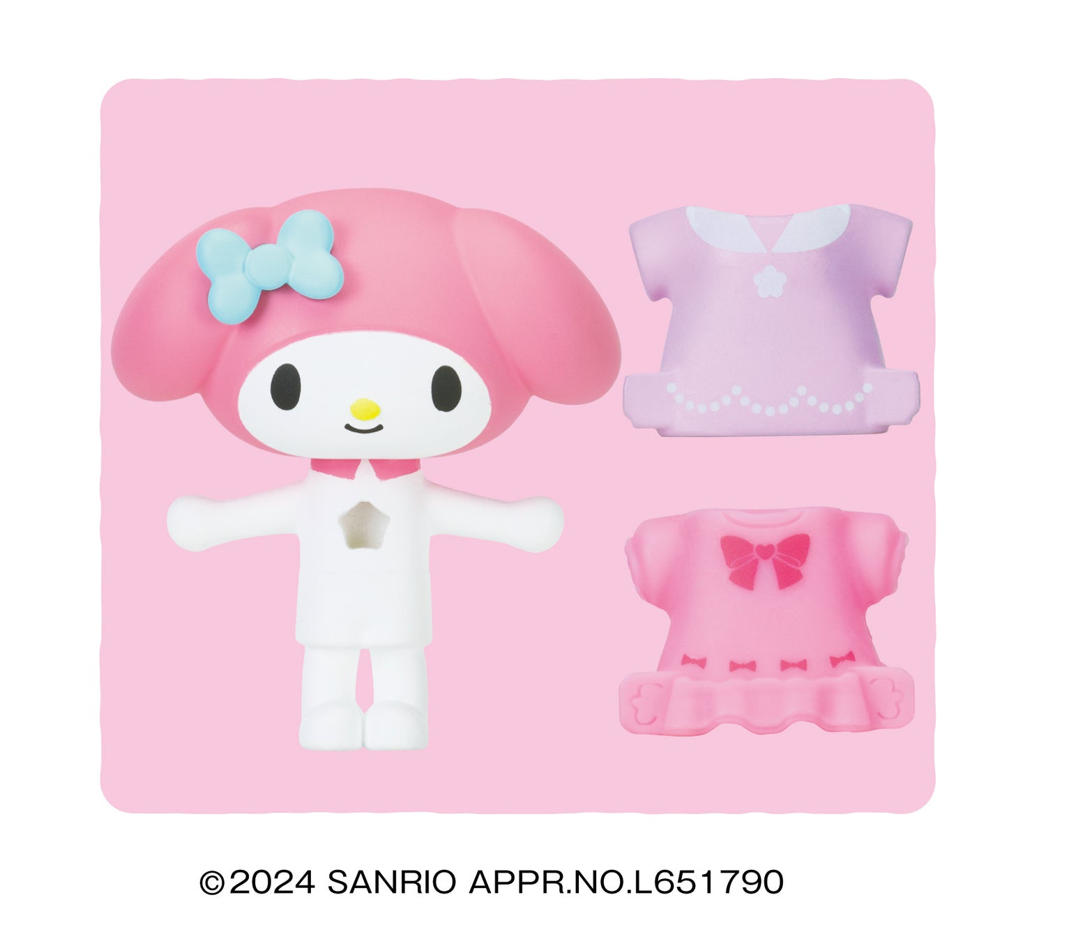 マイメロディ、クロミのフィギュアで、フィギュアの前後を挟むようにパチッと洋服をはめて着せることができます。各キャラクターの洋服は2着ずつ付属しており、それぞれのキャラクター世界観に合った素敵なドレスデザインになっています。