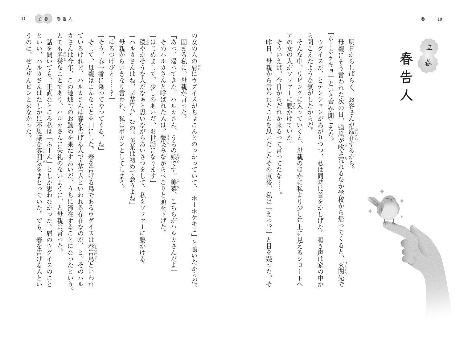 中学生の美菜が学校から帰ってくると、肩にウグイスをのせた女の人がソファに座っていた。母親はその女の人を「春一番に乗ってやってくる“春告人”」だと言うが――。