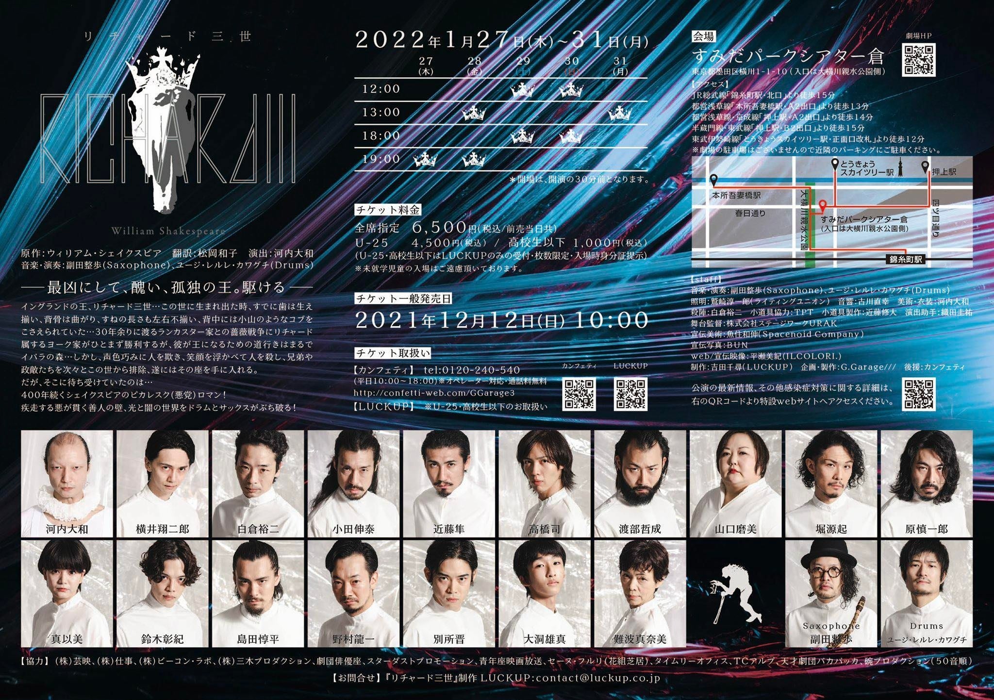 G.Garage/// 第三回本公演『リチャード三世』が2022年1月27日(木)~1月31日(月)にすみだパークシアター倉(東京都墨田区)にて上演されます。チケットはカンフェティ(運営:ロングランプランニング株式会社、東京都新宿区、代表取締役:榑松 ⼤剛)にて発売中です。