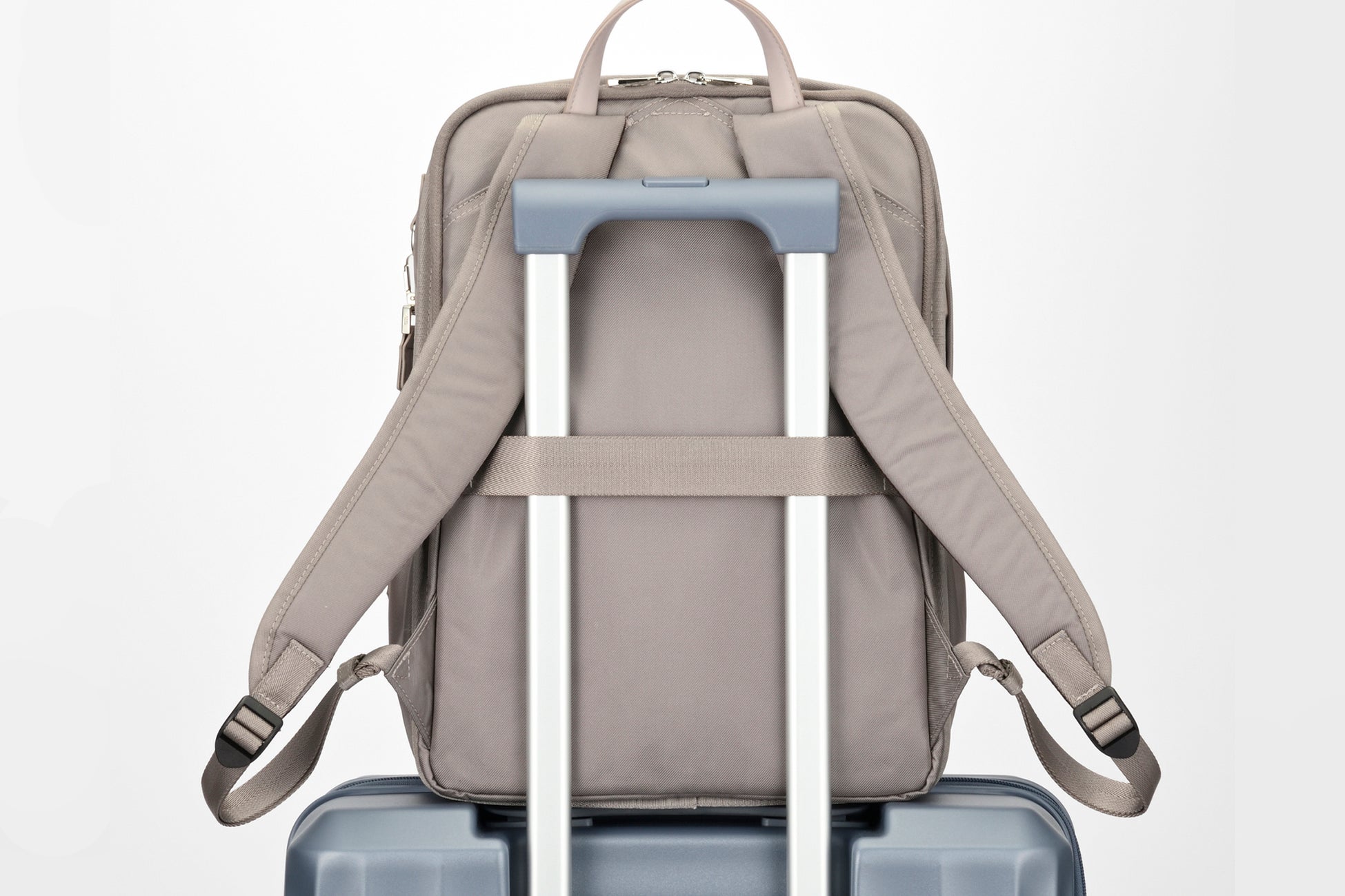 背面にスーツケースのプルドライブハンドルに固定できるセットアップベルトを配置。