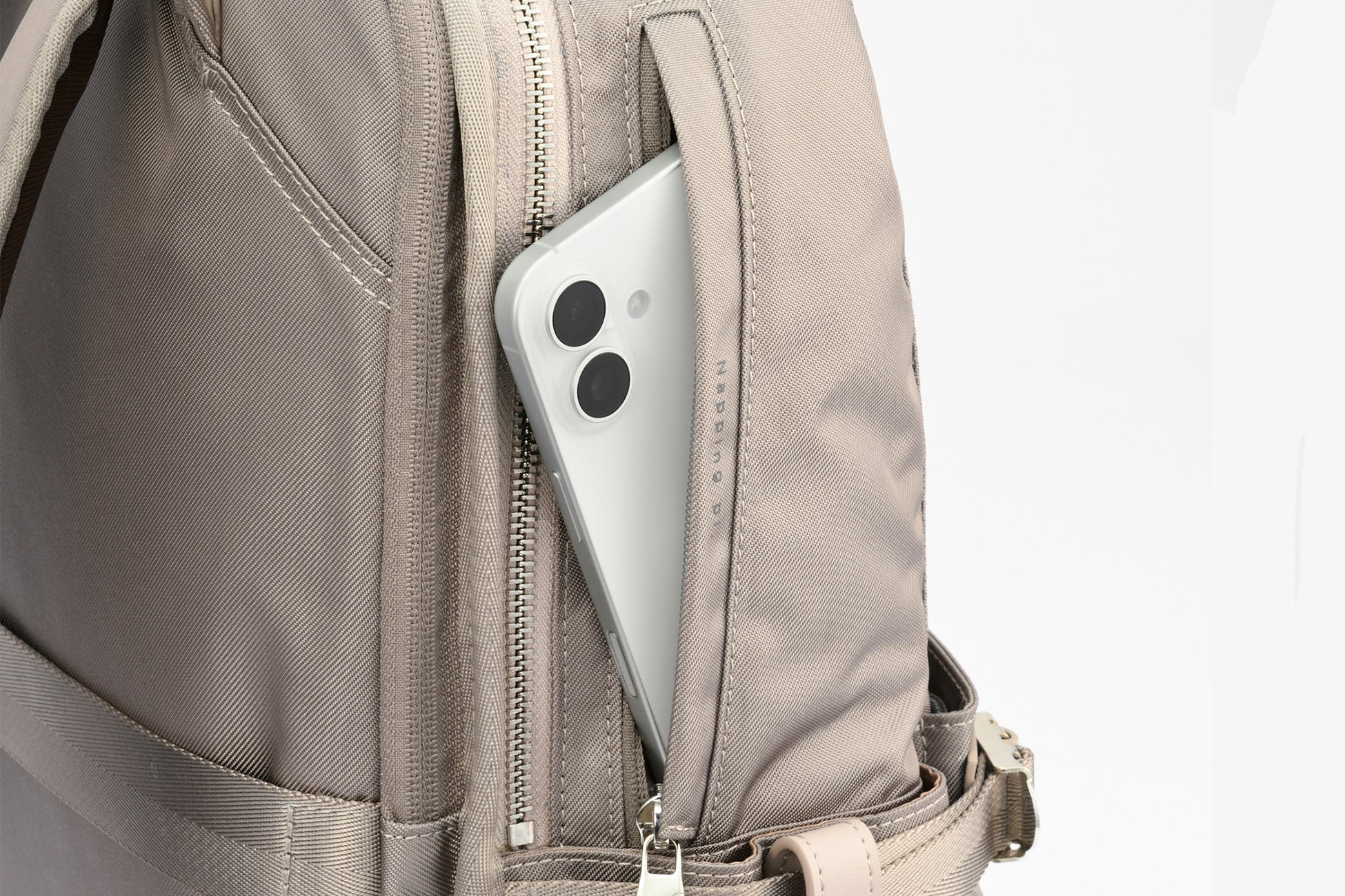中身が見えるシースルーポケットや、鍵などを繋げておけるキーストラップ、折り畳み傘も収納できるボトルホルダーなど、複数の機能を配置。忙しい朝もすぐに小物を取り出せる、ストレスフリーな使い心地です。