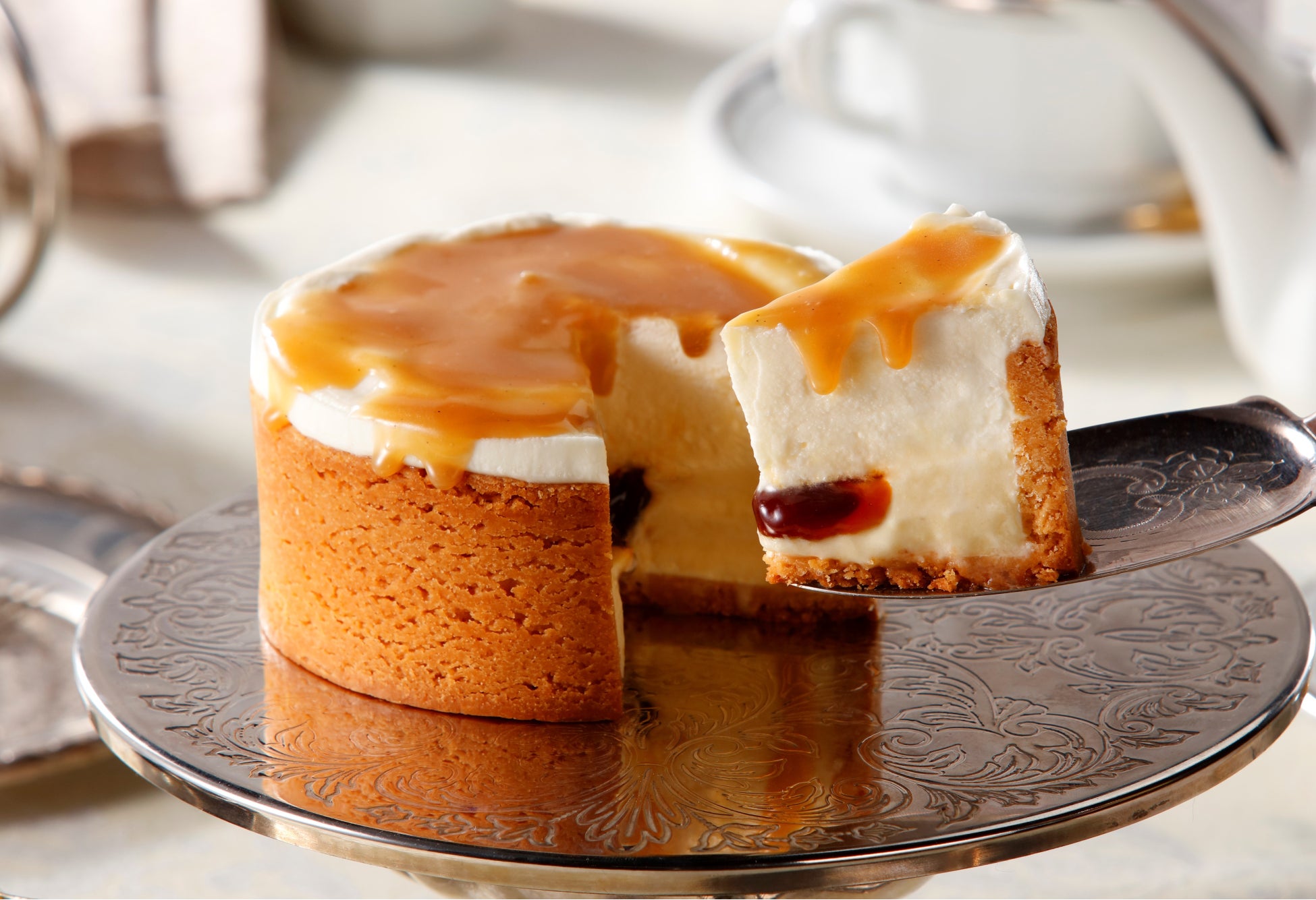 バターをきかせたタルト生地の器に、カスタードクリーム、ビターなキャラメルソース、さらにマスカルポーネのクリームを流した3層仕⽴ての贅沢な逸品でございます。
