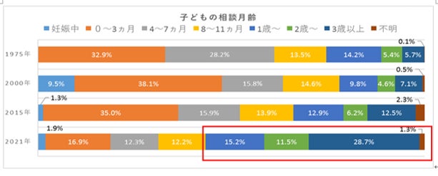 生後3ヵ月までの低月齢の時期に関する相談が多かったが、2021年以降は1歳以上の幼児に関する相談が半数を超えた。