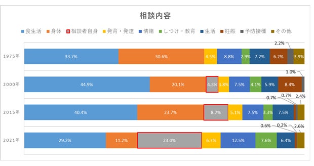 開設当初から、授乳や離乳食のことなど「食生活」は相談内容の中で最も多い項目として変わりはない。2021年においては、「相談者自身」に関する相談が赤ちゃんの「身体」に関する内容を抜き、相談内容の2位となった。人間関係の相談や育児のストレスに加え、近年コロナ禍において日常の何気ないことを周りと共有できにくく育児への孤立感が強まったこともその一因と見受けられる。
