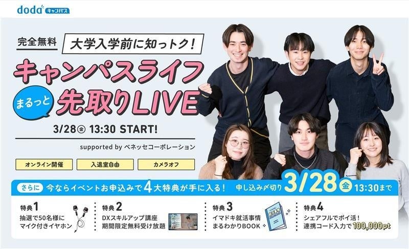 株式会社ベネッセホールディングスとパーソルキャリア株式会社の合弁会社:株式会社ベネッセ i-キャリア(本社:東京都新宿区、代表取締役社長:乾 史憲、以下i-キャリア)の新卒オファーサービス「dodaキャンパス」は、新大学一年生を対象にとしたオンラインイベント「大学入学前に知っトク!キャンパスライフまるっと先取りLIVE 」を、2025年3月28日(金)13:30より開催します。当イベントでは、4年間のキャンパスライフを充実させるために、失敗しないアルバイトの選び方や、アルバイトの経験を「ガクチカ※」にしていく方法など、大学入学前の今だからこそ知っておきたい情報をお伝えします。