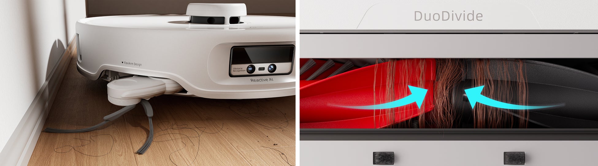 らせん状で二つに分かれたメインブラシと弧状デザインの非対称なサイドブラシの二つの「毛がらみ防止ブラシ」を採用し、髪の毛やペットの毛をスムーズに除去することで、毛のからまり度0%※1と、毛のからまり除去度100%※1を実現しました。らせん状で二つに分かれたメインブラシが、髪の毛を中央のダストボックスの入口へと導き、パワフルに吸引します。サイドブラシは、弧状デザインの非対称のブラシで、遠心力を利用したしなやかな動作によって、長い髪の毛やペットの毛などがからまることなく、ゴミをかき集めます。