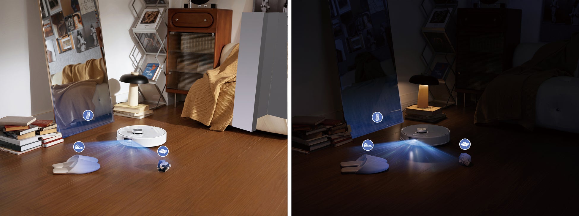 物体の距離や形状を判断する顔認証技術の原理を活用した高精度のストラクチャードライトと、RGBカメラを搭載しており、床にある物体をAIが瞬時に分析し、位置や種類を特定して回避※7します。最大62種類の物体を認識※7することができ、アプリのマップ上にアイコンが表示されます。LEDフィルライトを搭載しているので、暗い部屋でも認識・回避※7が可能です。カメラに関するプライバシー保護については、「ユーザーセキュリティー保護のためのTUV認証」※8を取得しているため、安心してご利用いただけます。