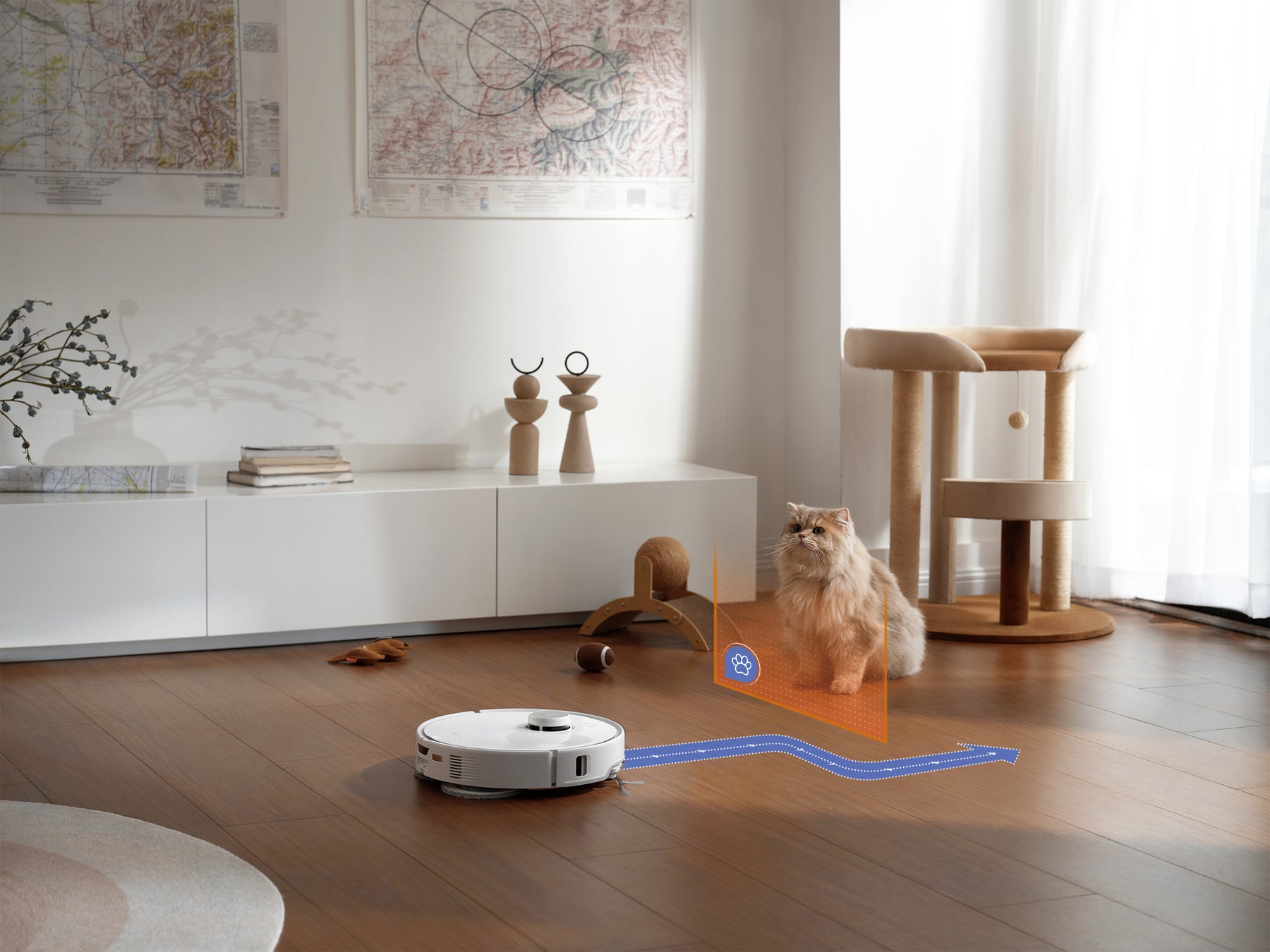 ロボット掃除機に搭載しているカメラで部屋の様子をリアルタイムで確認が可能な他、リモート操作でロボット掃除機本体を動かして、留守中のペットなどの様子を確認することができます。内蔵マイクを通して双方向通話も行えます。また、掃除中にペットが近づくと即座にメインブラシを停止し、ペットを驚かせないようにします。