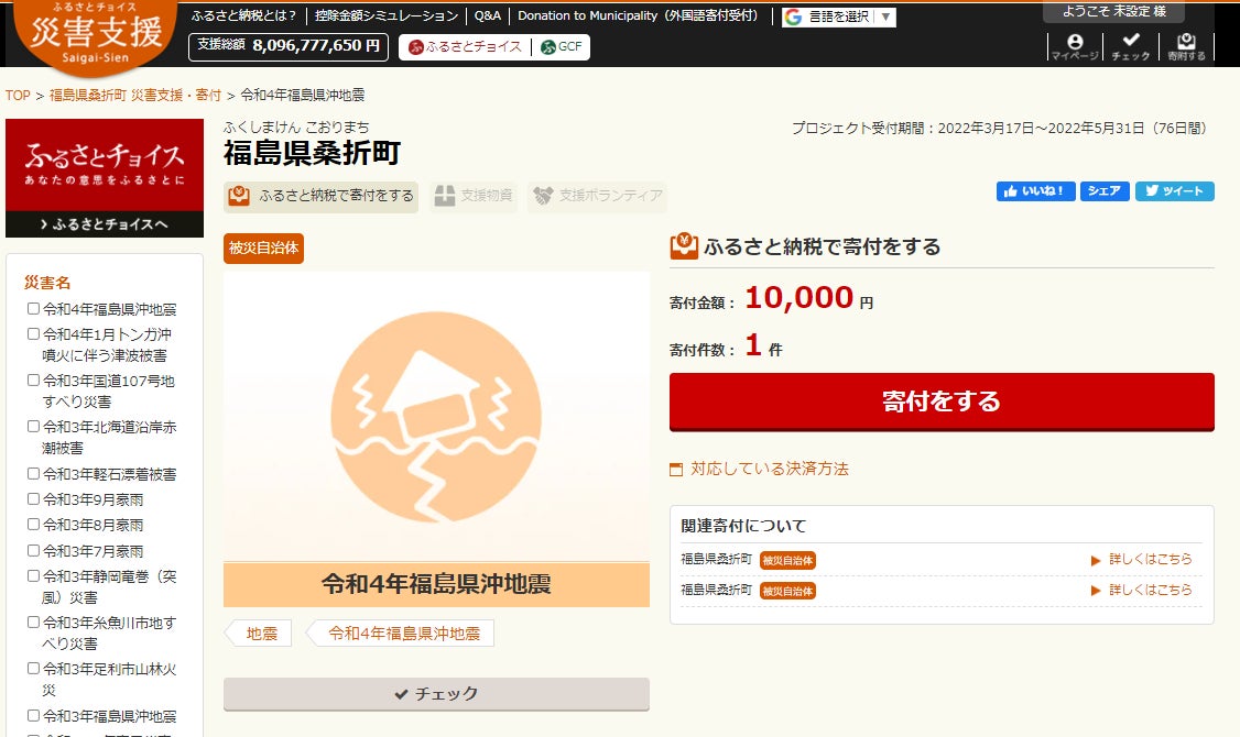 トラストバンク、ふるさとチョイス災害支援で 令和4年福島県沖地震のふるさと納税の寄付受け付けを開始