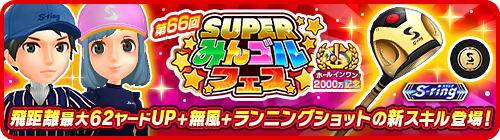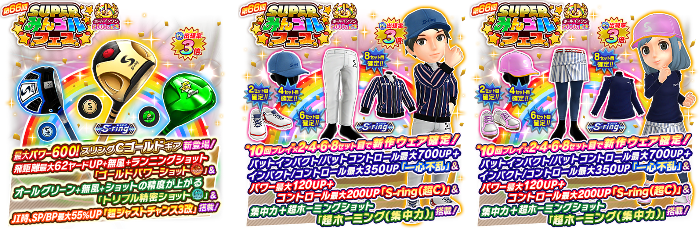 今回の「SUPERみんゴルフェス」には、「S-ring」シリーズから、最大パワーが600かつ、新アクティブスキル「ゴールドパワーショット」「トリプル精密ショット」のほか、パッシブスキル「超ジャストチャンス3改」を搭載した新ギア「スリングCゴールド」(クラブ/ボール)が登場いたします。ウェアガチャにも「一心不乱」「S-ring(超C) 」「超ホーミング(集中力)」など、複数スキルを搭載した新作ウェアが登場。さらに「10回プレイ」2・4・6・8セット目で新作ウェアが確定となります。ぜひ、ご参加ください!