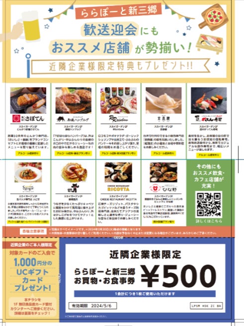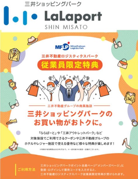 当社グループが運営する商業施設「三井ショッピングパーク ららぽーと新三郷」に近接しているため、「MFLP三郷」の従業員への各種クーポンの配布やコーポレート割引を検討しています。「ららぽーと新三郷」との連携により、さらなる雇用の確保と雇用の定着に寄与するサービスを提供いたします。