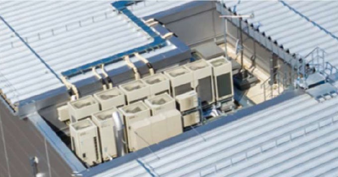 (1) 屋上の屋根を折半屋根ではなく一部陸屋根化し、キュービクルなど主要な電気設備を屋上に配置。