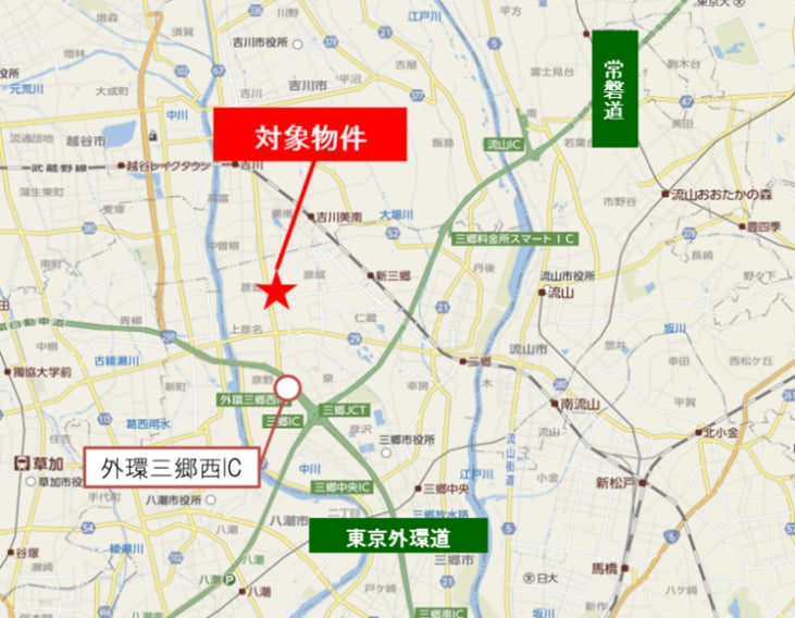 「MFLP三郷」は、関東近郊をつなぐ外環自動車道と都心をつなぐ常磐自動車道の結節点である三郷エリアに位置し、埼玉県三郷市にて進められている三郷北部土地区画整理事業地内にあります。外環自動車道「外環三郷西IC」から約2kmとインターチェンジに近接しており、東京都内と関東近郊を結ぶ広域物流拠点となり、都内配送のみならず関東一円の広域配送にも適した物流最適地に位置します。
