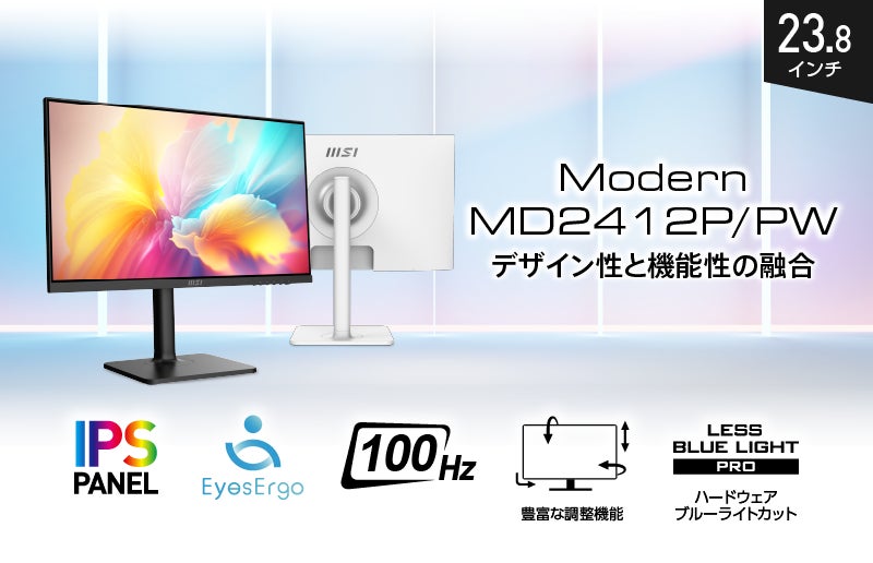「Modern MP2412P / PW」は黒・白のカラーバリエーションで、オフィス等の使用環境に合わせて色を選べ、手頃なサイズで設置場所を選ばない23.8インチモデルです。