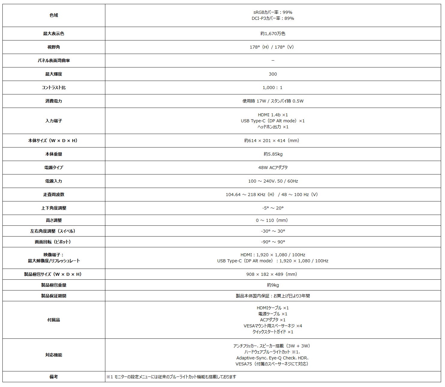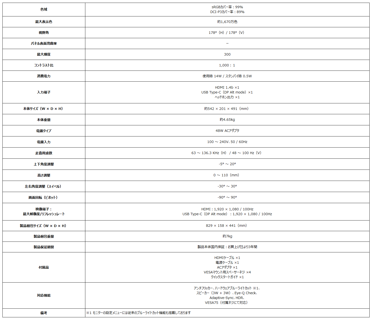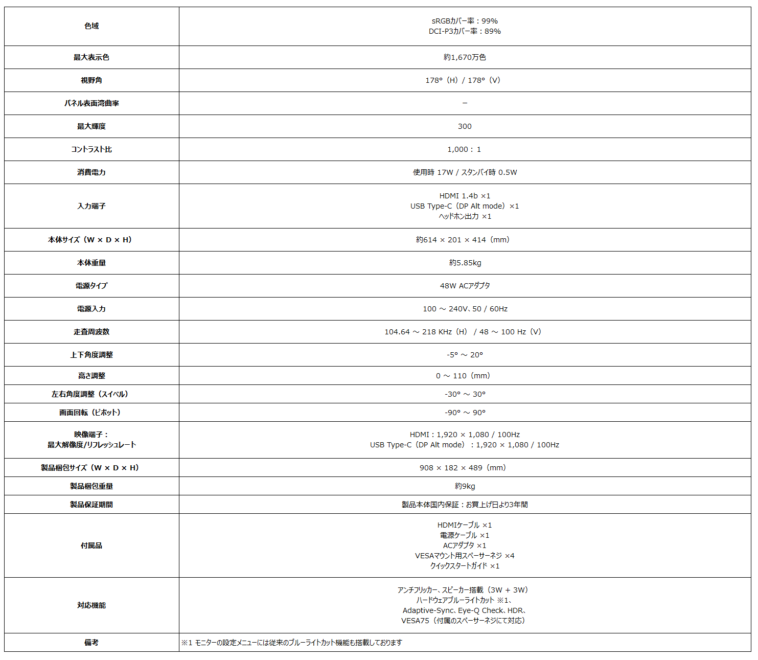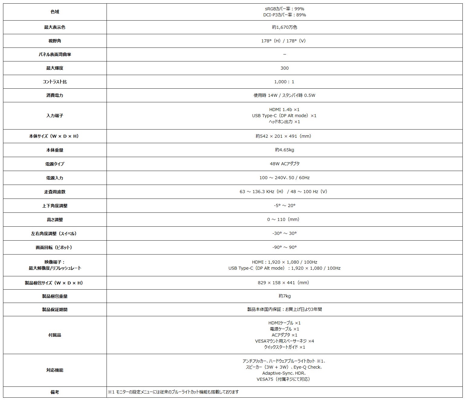 どちらの製品も共通事項として、高画質・広視野角が特徴なIPSパネルにゲーミングモニター並みの100Hzの高リフレッシュレート、応答速度1ms(MPRT)でスクロール時にも滑らかで残像感の少ない映像表示に加え、反射を抑えるノングレアパネル、チラつきを抑制するアンチフリッカー、色彩を変化させることが無いハードウェアブルーライトカットと、目に優しいEyesErgo機能を備えたモニターです。また、目の疲労具合や乱視、姿勢の確認などを行うことが可能なEye-Q Check機能も搭載し、90°回転して縦表示にすることも可能な多機能スタンド搭載で様々なポジションで使用することができ、スピーカー(3W + 3W)搭載により、別途スピーカーを用意する手間とスピーカーの設置スペースを省くことができます。また、3辺フレームレスデザインでマルチモニター環境の構築や、ユーティリティソフト「Display Kit」の使用で、キーボード・マウスからモニターの設定を行うことができます。さらに、映像入力端子はHDMI 1.4b ×1、USB Type-C(DP Alt mode)×1を備えており、ノートPCやデスクトップPCを接続でき、簡単に入力切り替えやメニュー操作を行うことが出来ます。VESA規格にも対応しており、モニターアームへの取り付けを行うことができるので、机の上のスペースを節約することが出来ます。