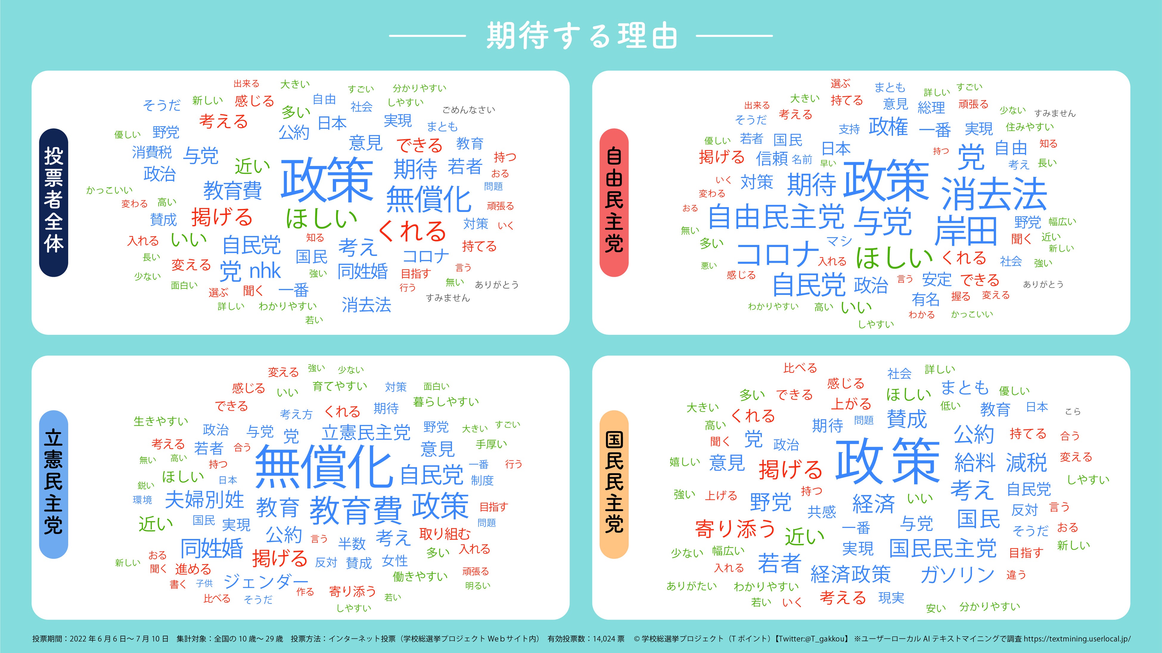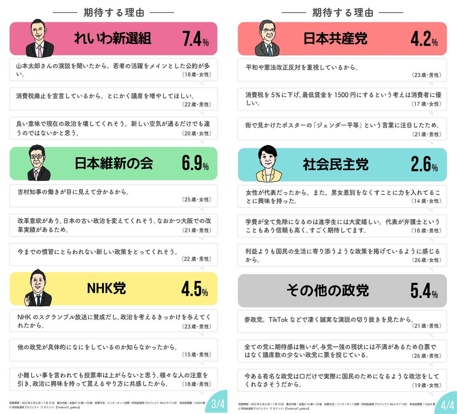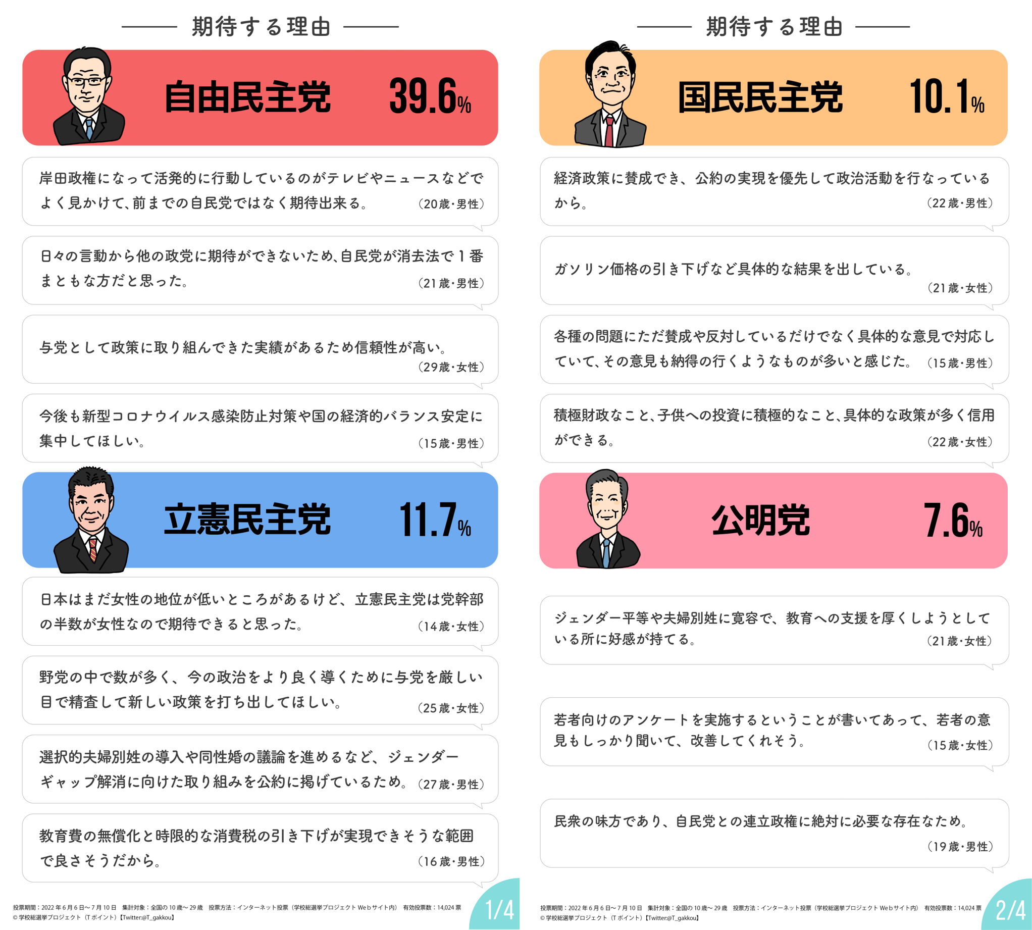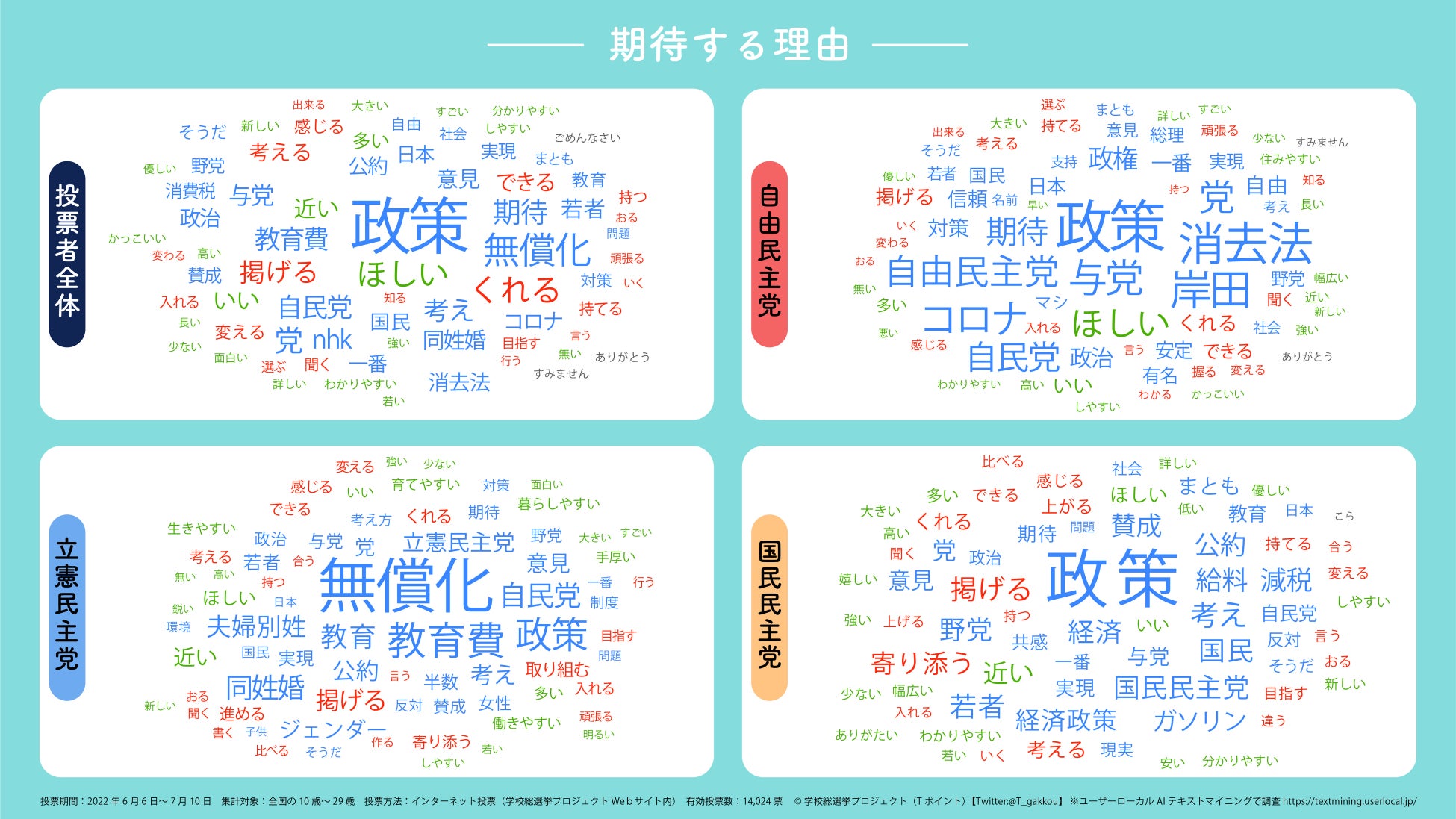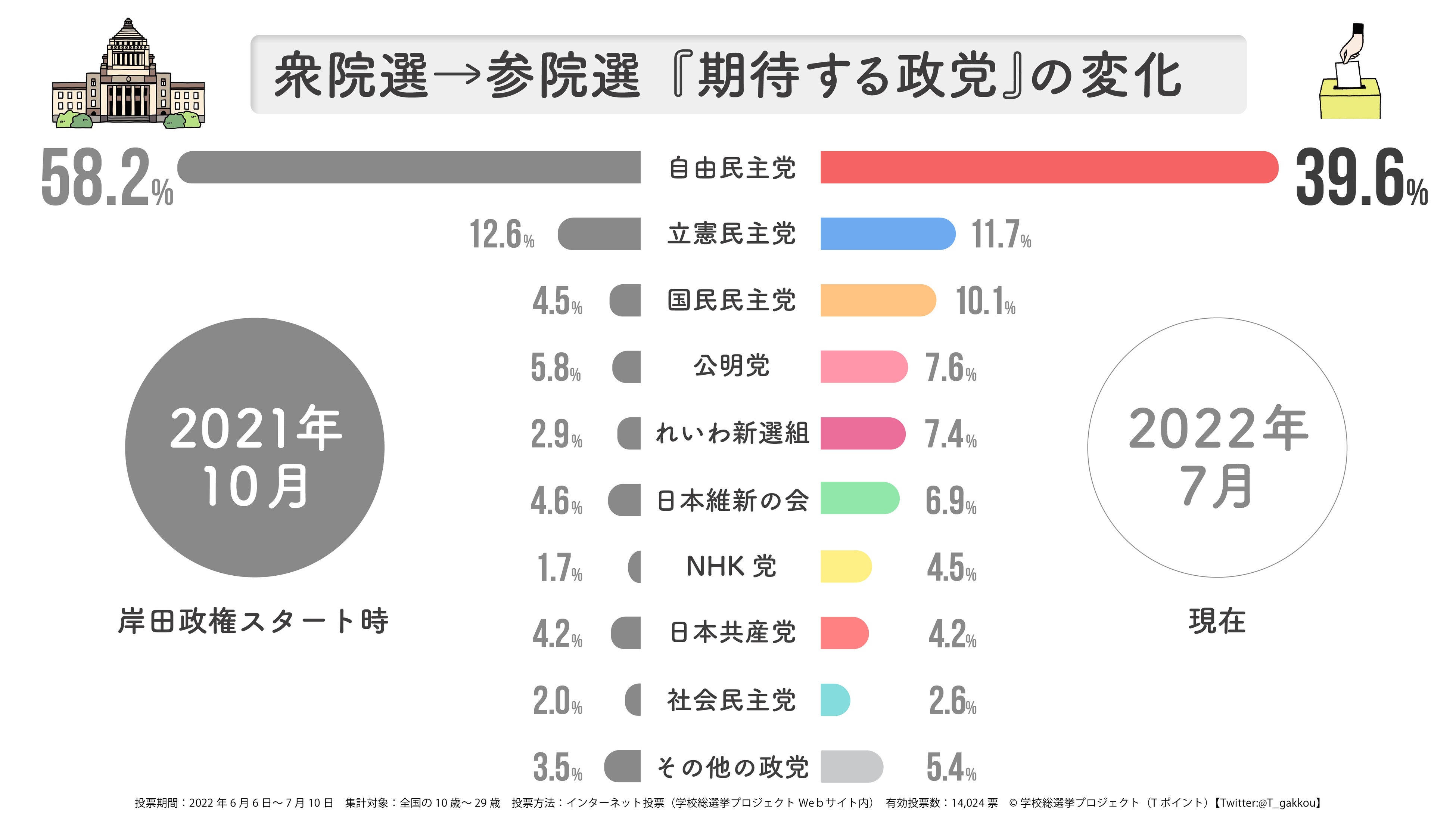 このたび「学校総選挙プロジェクト」では、7月10日に投開票を迎えた「第26回参議院議員選挙」の模擬投票として、2022年6月6日(月)~7月10日(日)までの間、オンライン投票によって全国の10~29歳までの若者世代に対して「期待する政党」について募ったところ、14,024票の投票をいただきました。
