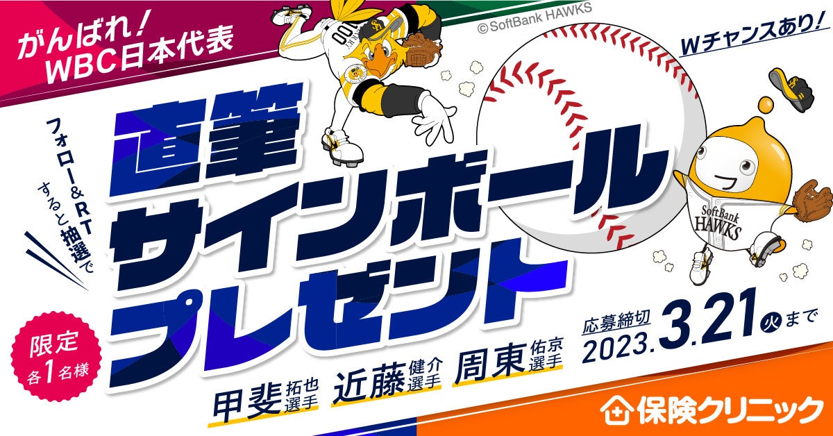 福岡ソフトバンクホークス2023年オフィシャルスポンサーの来店型保険ショップ『保険クリニック®』(全国●店舗 2023年3月8日時点、運営本部:株式会社アイリックコーポレーション 東京都文京区)は、ワールド・ベースボール・クラシック(以下、WBC)日本代表応援キャンペーンを実施いたします。