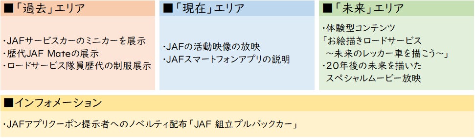 今回の出展ブースでは、このJAFのこれまでとこれからを「過去・現在・未来」の3つのテーマに分け表現いたします。