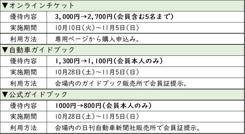 「Japan Mobility Show2023」では、チケットが割引になるJAF会員限定の優待や、そのほかモビリティショーをお得に楽しめる会員優待が実施されます。ご来場の際はぜひご活用ください。
