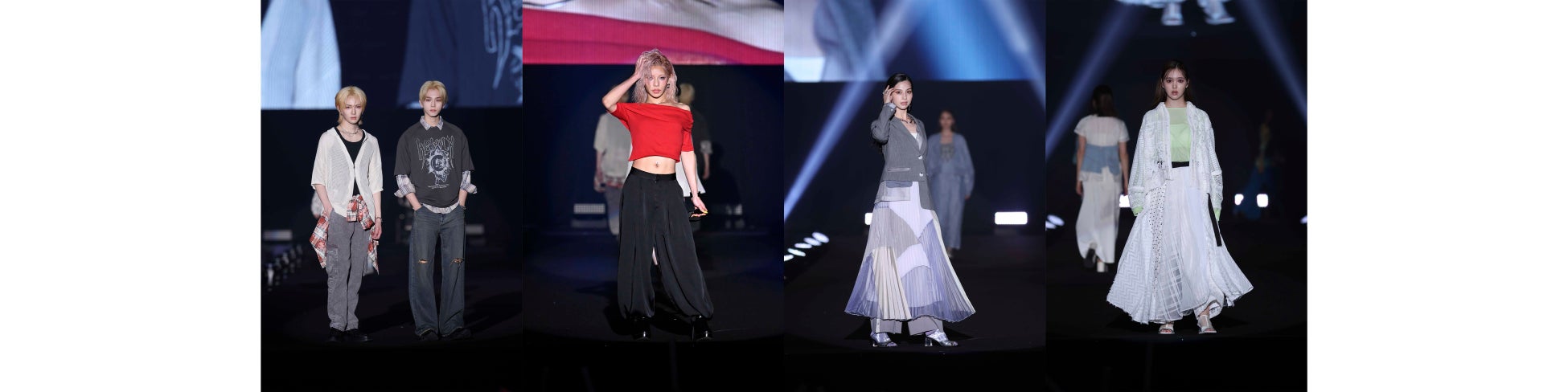 世の中のスタンダードが進化していく中で、古いものが持つスタイルとカルチャーの美点はそのままに、過去に縛られず、新しく新鮮なデザイン“NU STANDARD”を提案するAZUL BY MOUSSY(アズールバイマウジー)は、ジェンダーレスで自由なスタイルでありながら、スタイリッシュさも演出したスタイリングを披露。メンバー全員が2000年代生まれながら、そのカリスマ性、そしてクールでワイルドな世界観で注目を集めている8人組ボーイズグループEPEXのBAEKSEUNG、MUらに続き、ラストにはとうあが登場し、存在感のあるウォーキングで観客を圧倒しました。