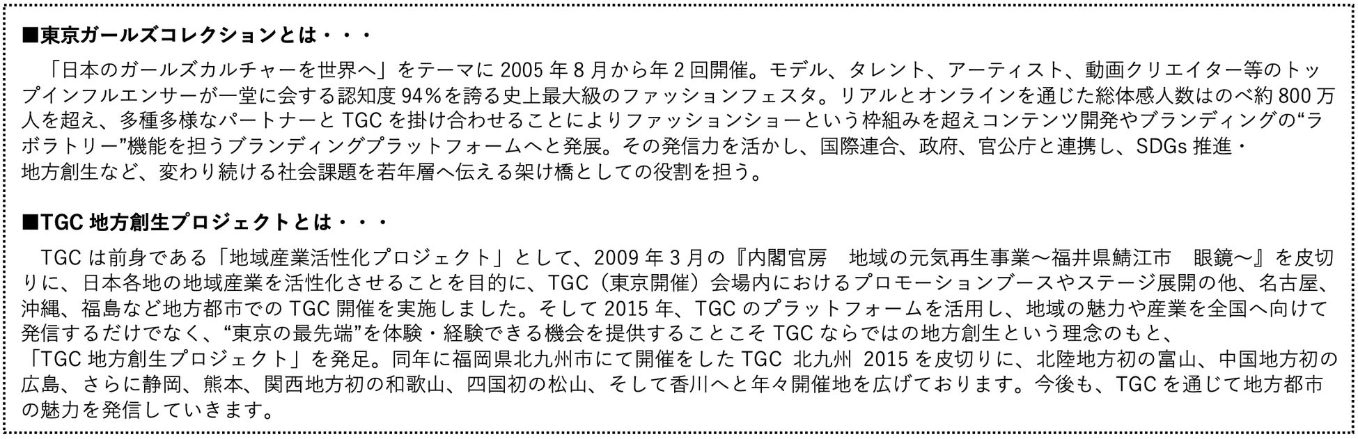 東京ガールズコレクション実行委員会(企画/制作:株式会社W TOKYO)は、2025年4⽉12⽇(⼟)にグランメッセ熊本にて、『麻生専門学校グループ presents TGC KUMAMOTO 2025 by TOKYO GIRLS COLLECTION(以下、TGC熊本)』を2年連続で開催いたしました。