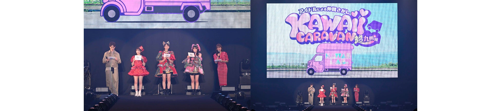 さらに、アソビシステムによるアイドルプロジェクト「KAWAII LAB.」から、今月2025年4月にデビュー2周年を記念した初のホールツアー『CANDY CANDY PARTY』の開催や、2nd シングルCD『推し♡好き♡しんどい』のリリースを控える7人組アイドルグループ・CANDY TUNEの福岡県出身メンバー立花琴未、村川緋杏、そして、FRUITS ZIPPERの福岡県出身メンバー月足天音が登場し、新プロジェクト「〜アイドルによる仲間探し〜KAWAII CARAVAN 超九州編」のスタートを発表!
