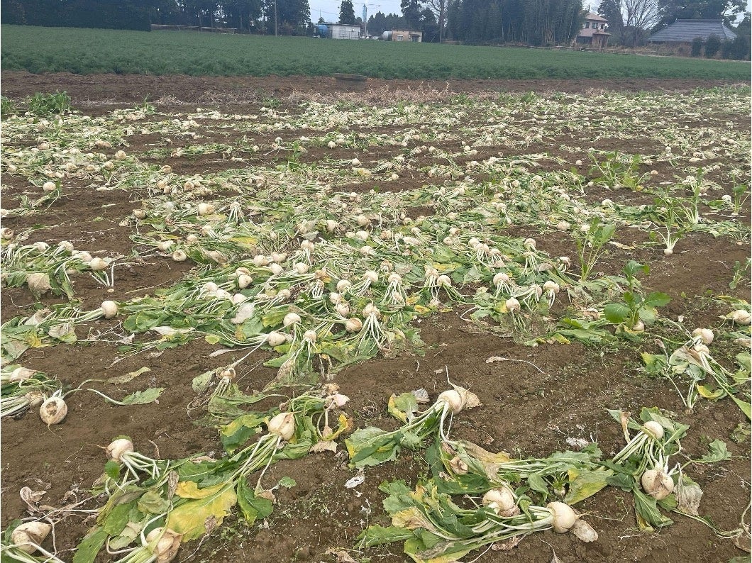 「今年は秋に続き冬になっても暑い日が続き、年末から1月の収穫を予定して植えつけたかぶまでその影響で一気に肥大化してしまいました。皮の成長が中身の成長に追い付かずに割れてしまうものも出ており、そういった割れの多い畑は畑ごと諦めている状況です。ぜひ少しでも多くの方に召し上がっていただければ幸いです」