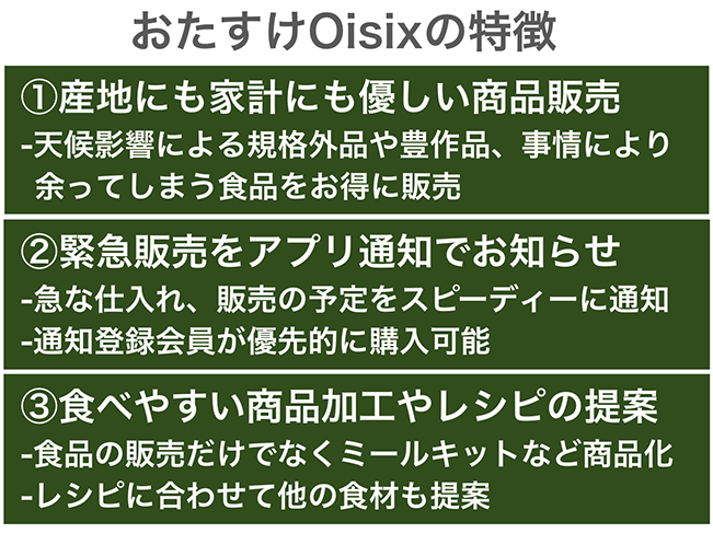 「おたすけOisix」は2022年8月2日のサービス開始から1年4ヶ月となります。通常よりお得な規格で販売し、また購入いただいたお客様への5%ポイントバックを実施しており、これまでに累計約250トンの青果をお届けしました。全国の産地の要請を受けて支援販売を強化しつつ、お客様のお役に立てるよう、当社サービスを通じた取り組みを推進してまいります。